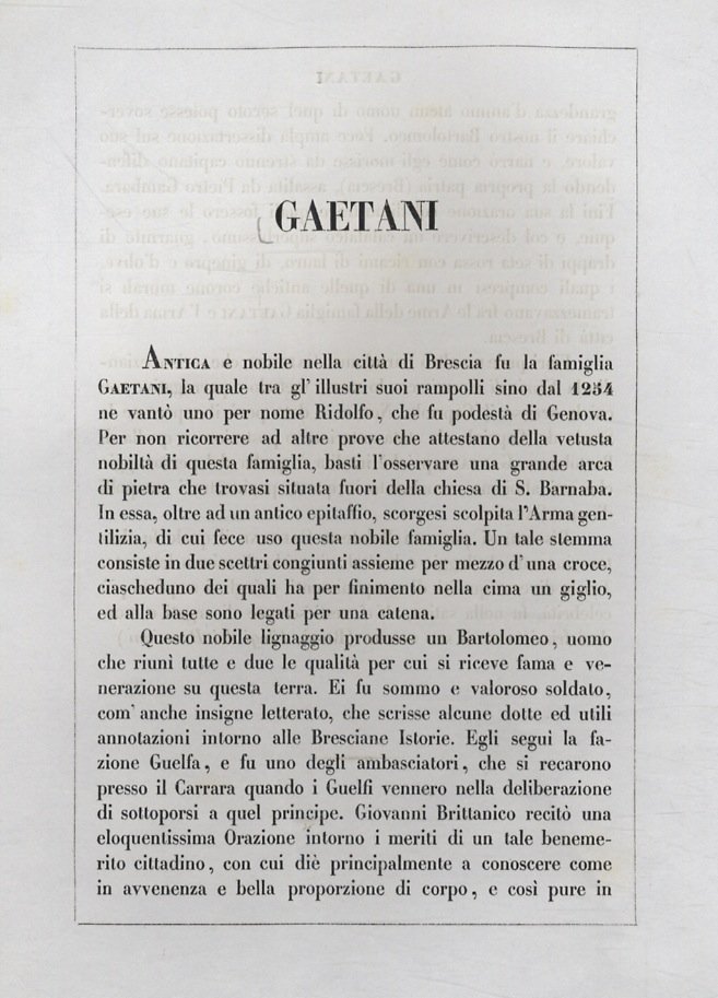 Lodi, Wilmant e figli, 1841-1848, in-4, privo di brossura, pp. [2]. Con uno stemma accuratamente miniato a mano all'epoca, su una tavola f.t. Fascicolo a fogli sciolti, dedicato alla storia della famiglia, tratto da "Teatro araldico, ovvero Raccolta generale delle armi ed insegne gentilizie delle più illustri e nobili casate che esisterono un tempo e che tuttora fioriscono in tutta Italia" di Leone Tettoni e F. Saladini, Lodi, Wilmant e figli, 1841-1848. Buone condizioni.