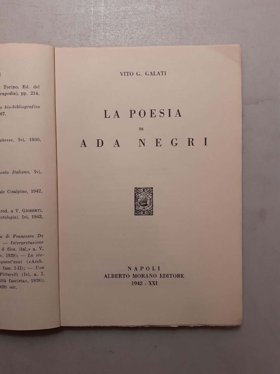 Galati,LA POESIA DI ADA NEGRI, Alberto Morano Editore, Napoli, 1942