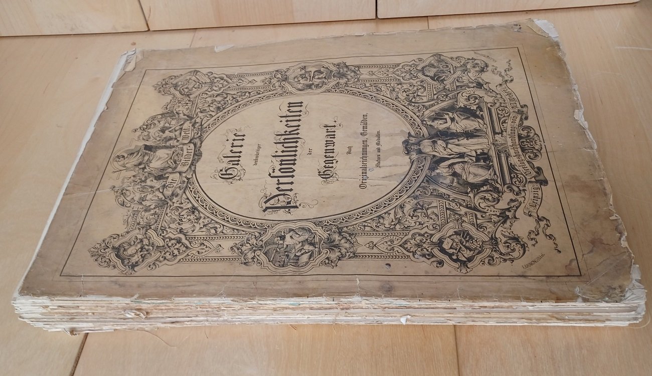 Enthält über 1000 Holzstich-Porträt-Abbildungen, ein Inhaltsverzeichnis und biographische Angaben zu den abgebildeten Personen (unter anderem Manteuffel, Schiller, Goethe, Th. Moore, Harriet Becher-Stowe, Kaiser Franz Joseph, Franz Liszt, Don Pedro von Brasilien, Ferdinand Freiligrath, R. Wagner, Wordsworth, Nikolaus Kaiser von Rußland, Papst Pius IX, Fanny Eißler, Schlegel, Herder, Louis Jacques Daguerre, Napoleon, Verdi, Gustav Adolf von Schweden, Otto I. König von Griechenland etc., etc., etc. - SEHR RAR!