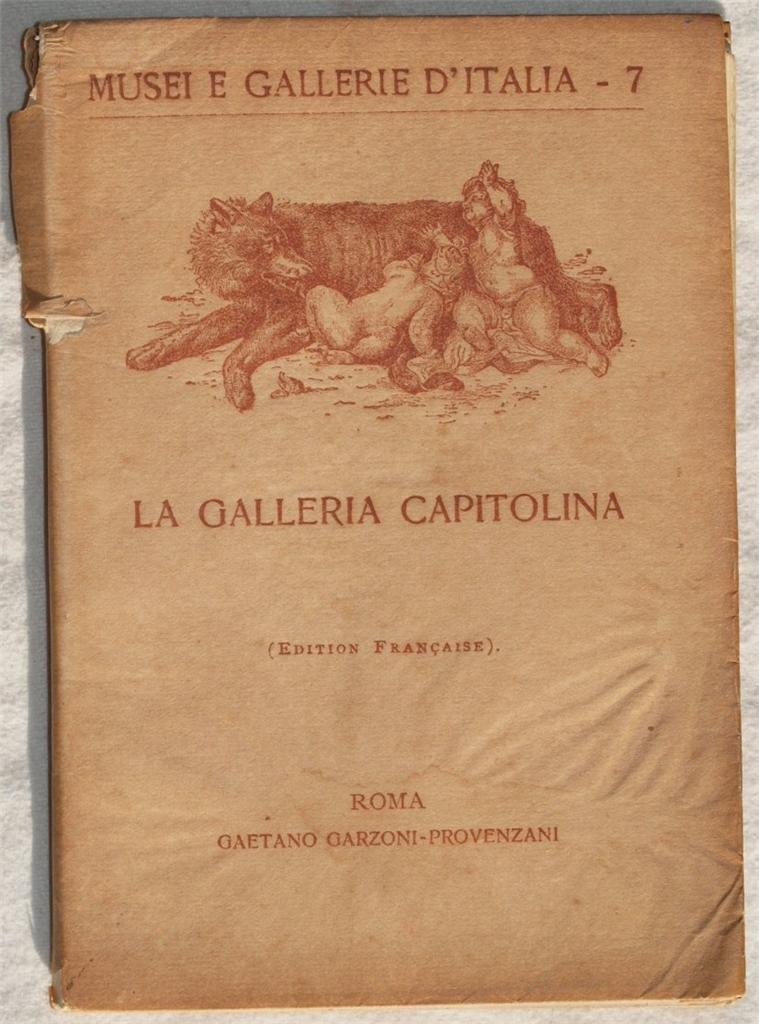 In 16. Dim. 15,5x11 cm. Pp. XVI+63+(5). Edizione del 1911 di questa guida della collana (Musei e gallerie d'Italia" n. 7. Il volume è dedicato alla Galleria Capitolina. All'inizio descrizione della galleria, seguono 64 planches fotografiche. Testo francese. In discrete condizioni. Copertina in carta pergamenacea editoriale in buone condizioni generali con lievi usure ai margini e dorso. Legatura in discrete condizioni con rotture. All'interno le pagine si presentano in ottime condizioni con rare fioriture. Edition of 1911 of this guide of the series (Musei e gallerie d'Italia" n. 7. The volume is dedicated to the Galleria Capitolina. At the beginning description of the museum, then 64 photographic planches. French text. In good conditions. False parchment editorial cover in very good general conditions slightly worn in the edges and spine. Binding in fair conditions with cracks. Inside pages are in very good conditions with occasional foxings.