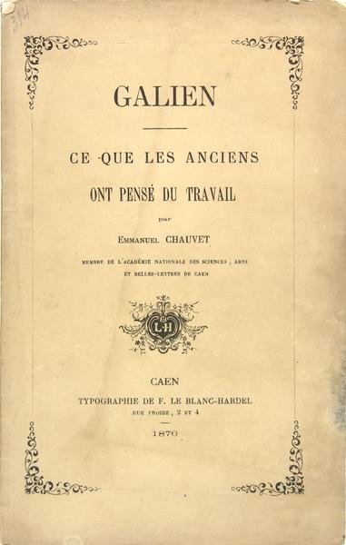 Caen, typographie de F. Le Blnc Hardel, 1876. Plaquette in-8, couverture imprimée, 25 pages. Jérôme Auguste Emmanuel Chauvet (1819 - 1910). Professeur de philosophie. Dans le prolongement de sa thèse latine [1855], Emmanuel Chauvet consacre une grande partie de ses travaux à la médecine de l’antiquité, plus particulièrement à Galien.