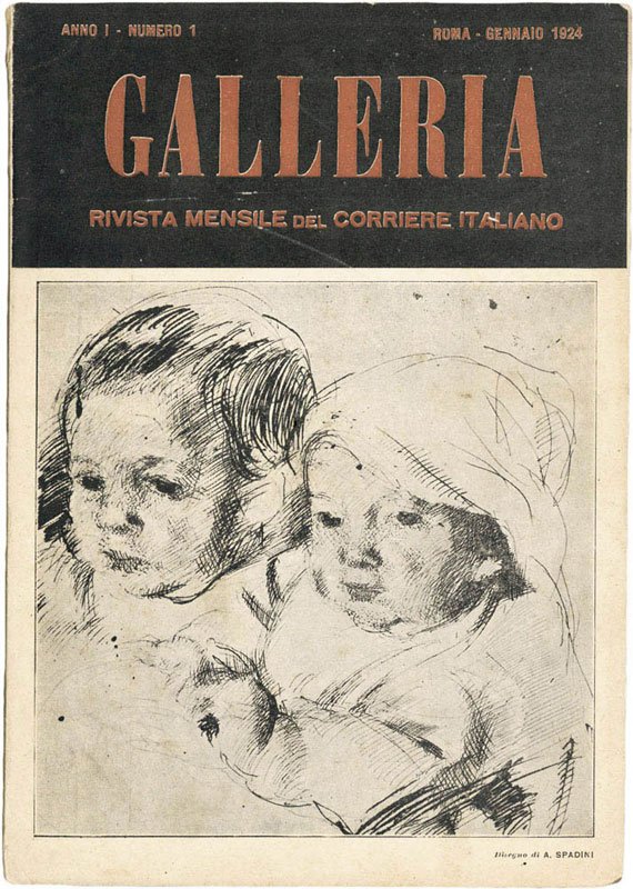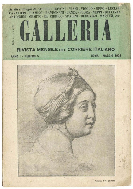PERIODICOEdizione originale.Tutto il pubblicato in fascicoli sciolti in ottimo stato.Mensile supplemento del quotidiano romano «Corriere italiano» di Filippo Filippelli. Diretto da Ardengo Soffici, si pubblicarono 5 fascicoli dal gennaio al maggio 1924: «Dall’aprile 1924 l’inedito carteggio tra Baldini e Soffici, che lascia Roma per stabilirsi a Poggio a Caiano, testimonia le difficoltà economiche in cui si trova la rivista e, di conseguenza, nei rapporti con Fillippelli che pretende maggior attualità in “Galleria”. Quando è ormai pronto per la stampa il sesto fascicolo, a causa dell’involontaria implicazione nel delitto Matteotti e del successivo arresto del direttore del “Corriere Italiano”, il quotidiano e la rivista sono costretti a chiudere le pubblicazioni». -- Nata dietro l’esempio della più longeva «La Lettura», supplemento del «Corriere della sera», «Galleria» presenta un’attenzione tutta particolare al versante artistico: -- «Sulla copertina di ciascuno dei cinque fascicoli è riprodotto un disegno, considerato parte integrante della rivista tanto da essere segnalato nel Sommario, rispettivamente di: Armando Spadini, Medardo Rosso, Ardengo Soffici, Arturo Mancini, Vincenzo Gemito.» (ivi). -- «Grande cura è infatti riservata alla parte grafica: dipinti o disegni d’apertura, testatine e finalini — spesso sostituiti da disegni autonomi — rivelano una meticolosa ricerca e una raffinata sensibilità nella scelta, in cui molta parte ha Antonio Baldini [.] sempre numerose sono le illustrazioni all’interno con fotografie, riproduzioni di dipinti e sculture, disegni — molte le caricature — e xilografie. Dal fascicolo n. 2 la pagina del Sommario riserva le righe finali a “Disegni e caricature di” con l’elenco degli artisti illustratori: Armando Spadini, Ardengo Soffici, Leonetta Cecchi Pieraccini, Ottone Rosai, Amerigo Bartoli, Cipriano Efisio Oppo, Giorgio De Chirico, Marcello Dudovich, Alberto Martini, Deiva De Angelis, Michele Cammarano, Bepi Fabiano, il vignettista Camerini e Memmo Genua» (ivi).