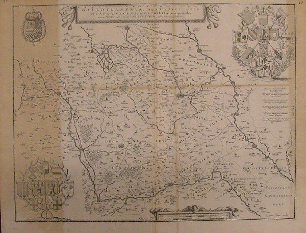 Carta geografica di cm. 42 x 55. Cartiglio al centro del marg. sup. Diverse armi poste agli angoli della carta. Scale al centro del marg. inf. Lieve brunitura lungo i marg. esterni.