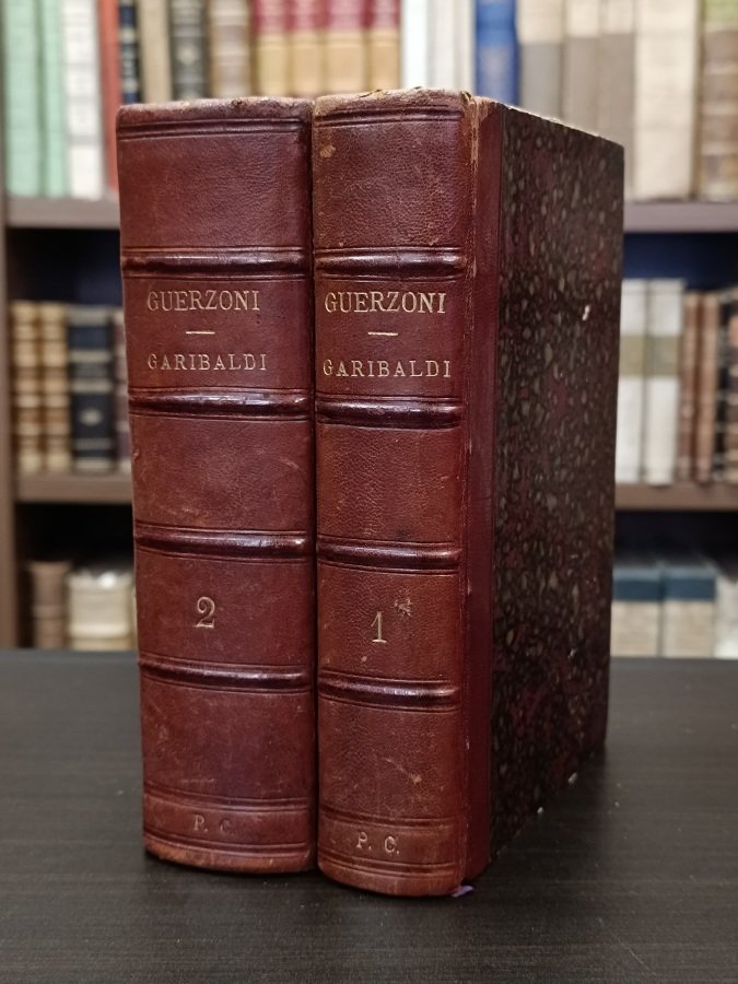 <span style="font-style: normal;">2 volumi in-16° (cm. 18,1), legature coeve in mezza pelle rossa, dorsi a nervi con titolo in oro e filetti a secco, iniziali «P.C.» in oro ai piedi (alcune tracce d'uso), piatti e risguardi marmorizzati, tagli spruzzati; pp. XXXIV 513 [3], con 3 tavole fuori testo più volte ripiegate; [4] 689 [3], con 7 piante topografiche su tavole fuori testo, di cui molte più volte ripiegate; in buono stato (alcune fioriture sparse; 1 carta geografica con rinforzo; </span><i>Ex Libris</i><span style="font-style: normal;"> impressi ai frontespizi). Prima edizione di questa celebre opera del Guerzoni, che fu segretario personale di Garibaldi per ben quattro anni. Cfr. Pieri, </span><i>Storia militare del Risorgimento</i>, 845; Campanella 369; Parenti 289. Buon esemplare. (NQ9)