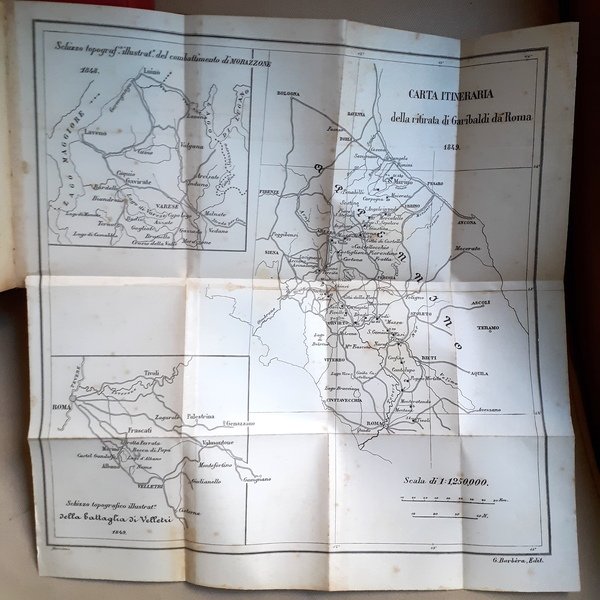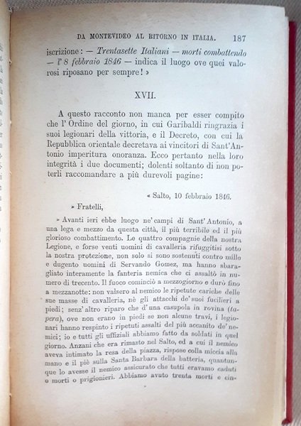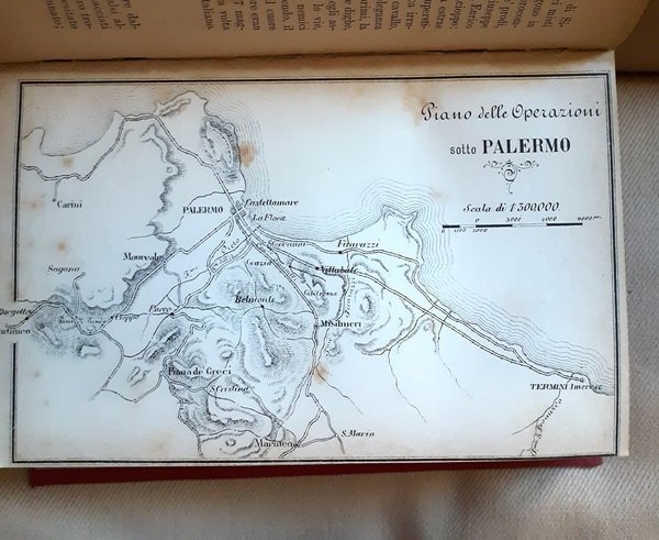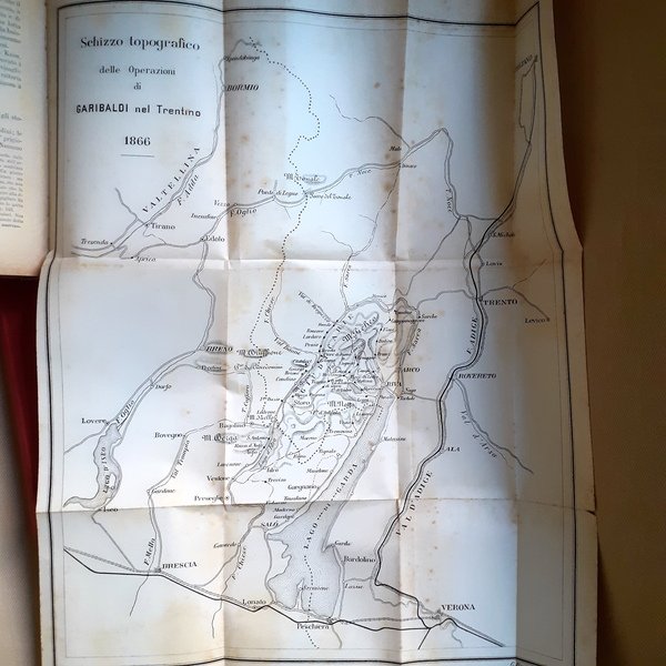 In-4°, Due volumi rilegati in tela rossa, XXXIV, pp 513, (1); pp 688. buono stato di conservazione. Il primo volume è corredato dal facsimile delle memorie di Garibaldi, di una carta dell’Uruguay e della carta itineraria della ritirata di Garibaldi da Roma, il secondo volume presenta 7 piante topografiche (Carta della Sicilia, battaglia di Milazzo, piano delle operazioni sotto Palermo, piano della giornata del Volturno, schizzo topografico delle operazioni di Garibaldi nel Trentino 1866, schizzo topografico dell’insurrezione romana, schizzo topografico della campagna di Francia 1870)In-4°, two books bound with red cloth binding, XXXIV, pp 513, (1); pp 688, good state. The first volume is accompanied by a facsimile of Garibaldi’s memoirs, a map of Uruguay and a map of the itinerary of Garibaldi’s retreat from Rome, the second volume presents 7 topographical maps (Map of Sicily, Battle of Milazzo, plan of operations under Palermo, plan of the day of the Volturno, topographic sketch of the operations of Garibaldi in the Trentino 1866, topographic sketch of the Roman insurrection, topographic sketch of the campaign of France 1870)