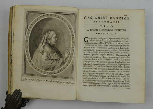Due volumi legati in uno di cm. 23, pp. xlviii, 336; (4) 184. Primo frontespizio in rosso e nero, belle testate e capolettera incisi e 2 ritratti a piena pagina. Solida legatura coeva in piena pergamena rigida con titoli impressi al dorso. Esemplare genuino e ben conservato. Ottima edizione delle opere dei due umanisti bergamaschi.