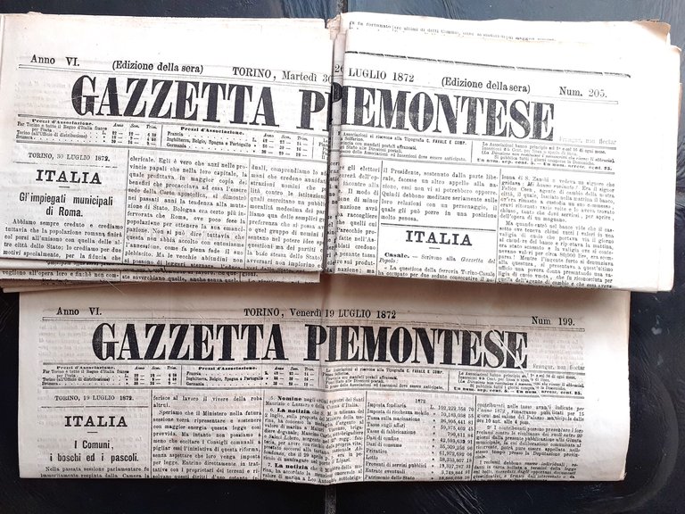 Gazzetta PiemonteseQuotidiano fondato da Vittorio Bersezio e Casimiro Favale nel 1867. Pubblicato dal 9 febbraio 1867 al 24-25 dicembre 1894 ; stampato a Torino dalla Tipografia G. Favale e Comp.