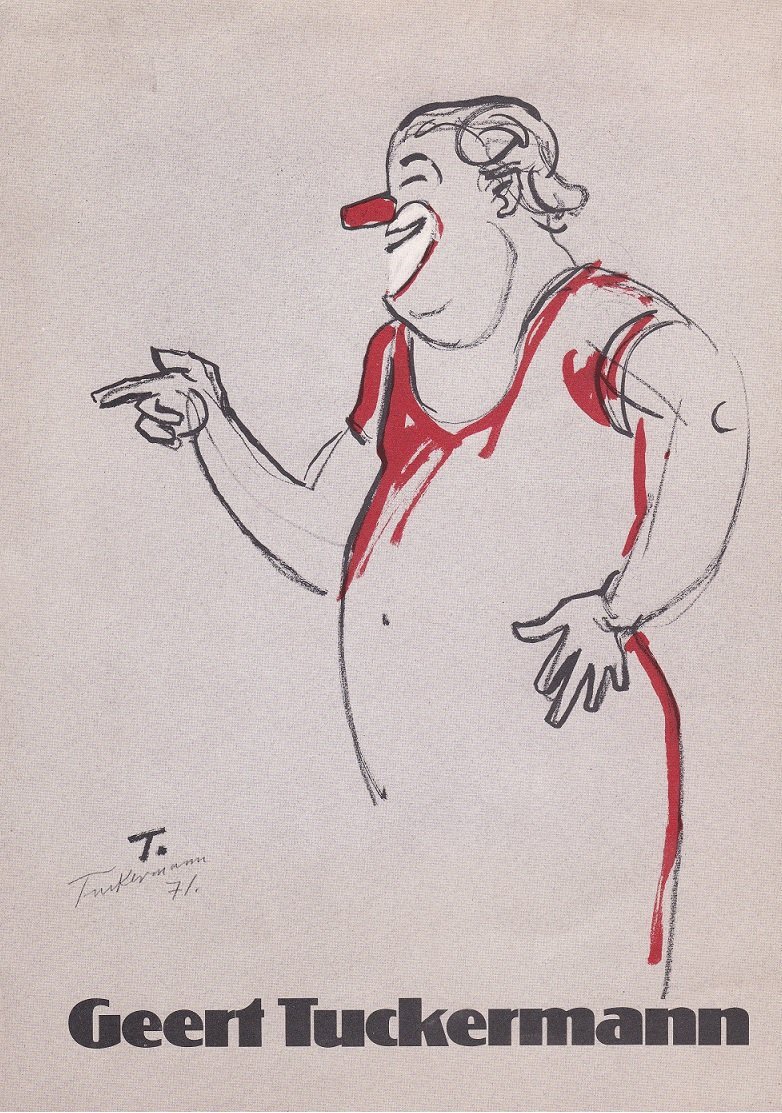 Ausstellungsveröffentlichung der Kommunalen Galerie Berlin (Charlottenburg-Wilmersdorf) im Oktober 1980 zum Künstler Geert Tuckermann. Deckel zeigt als farbige Illustration Tuckermanns eine Clownsfigur, im Bild signiert mit "T. 71". 4 Seiten (festes Papier) mit biografischen Textteilen zum Künstler, vor allem jedoch mit Abbildungen (weitgehend in schwarz/weiss) aus dem zeichnerischen Schaffen Tuckermanns, ohne Mappe. Seltene Ausstellungspublikation!