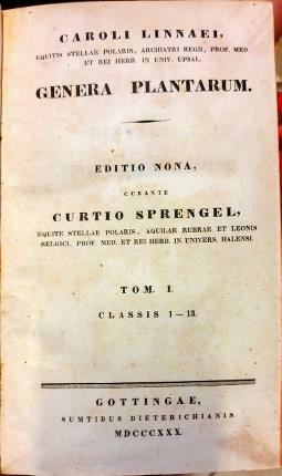 Genera plantarum. Due Tomi. Caroli Linnaei equitis stellar polaris, archiatri regii, prof. med. et rei herb. in Univ. Upsal. Editio nona, curante Curtio Sprengel, equite stellae polaris, aquilae rubrae et leonis belgici, prof. med. et rei herb. in Univers. Halensi.