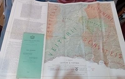 Carta geografica di cm. 78x58, ripiegata e raccolta in brossura editoriale, Sul lato sinistro raffig. la Tavola di Bronzo contenente la sentenza emessa dai fratelli Minucii per delegazione del Senato di Roma l'anno 117 Avanti l'E.V. A destra la carta a colori con la divisione delle popolazioni liguri. (Appendice al volume XXX della Soc. Ligure di Storia Patria. -(La tavola bronzea di Polcevera è una lamina di bronzo sulla quale è incisa un'iscrizione in lingua latina che riporta il testo della Sententia Minuciorum, una sentenza emessa dal Senato romano nel 117 a.C. Il reperto, di primaria importanza non solo per la storia locale, ma anche per la storia del diritto, l'epigrafia e la linguistica, è ora conservato nel Museo Civico di Archeologia Ligure di Genova Pegli).