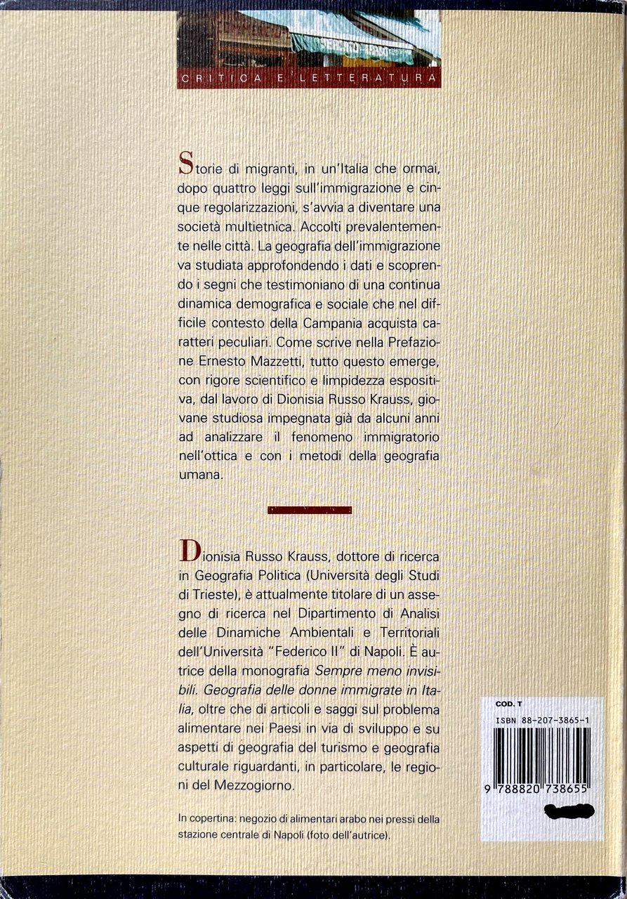Storie di migranti, in un'Italia che ormai, dopo quattro leggi sull'immigrazione e cinque regolarizzazioni, s'avvia a diventare una società multietnica. Accolti prevalentemente nelle città. La geografia dell'immigrazione va studiata approfondendo i dati e scoprendo i segni che testimoniano di una continua dinamica demografica e sociale che nel difficile contesto della Campania acquista caratteri peculiari. Come scrive nella Prefazione Ernesto Mazzetti, tutto questo emerge, con rigore scientifico e limpidezza espositiva, dal lavoro di Dionisia Russo Krauss, giovane studiosa impegnata già da alcuni anni ad analizzare il fenomeno immigratorio nell'ottica e con i metodi della geografia umana.