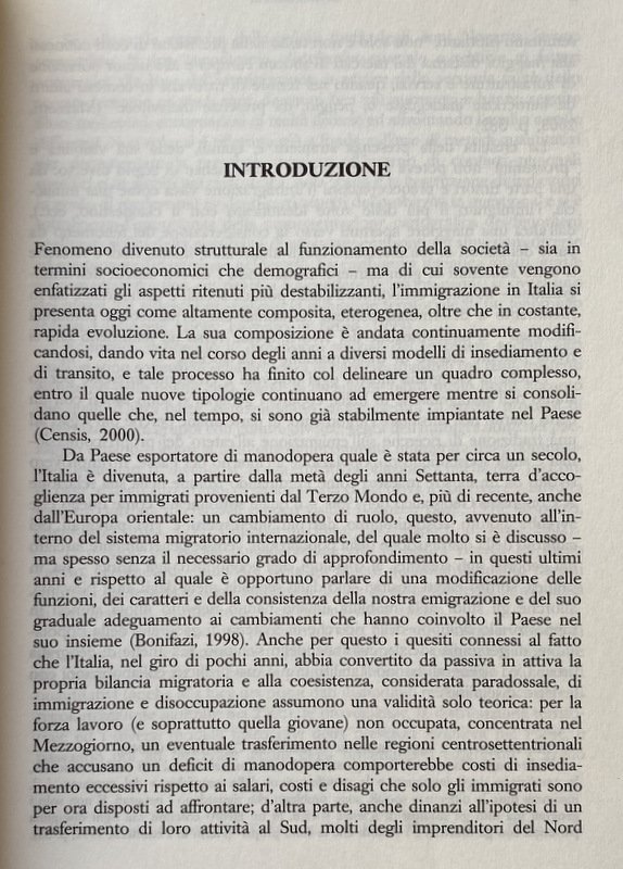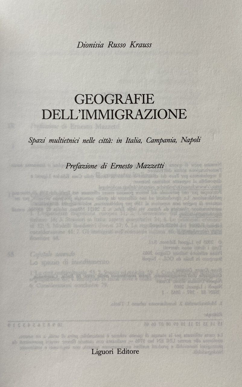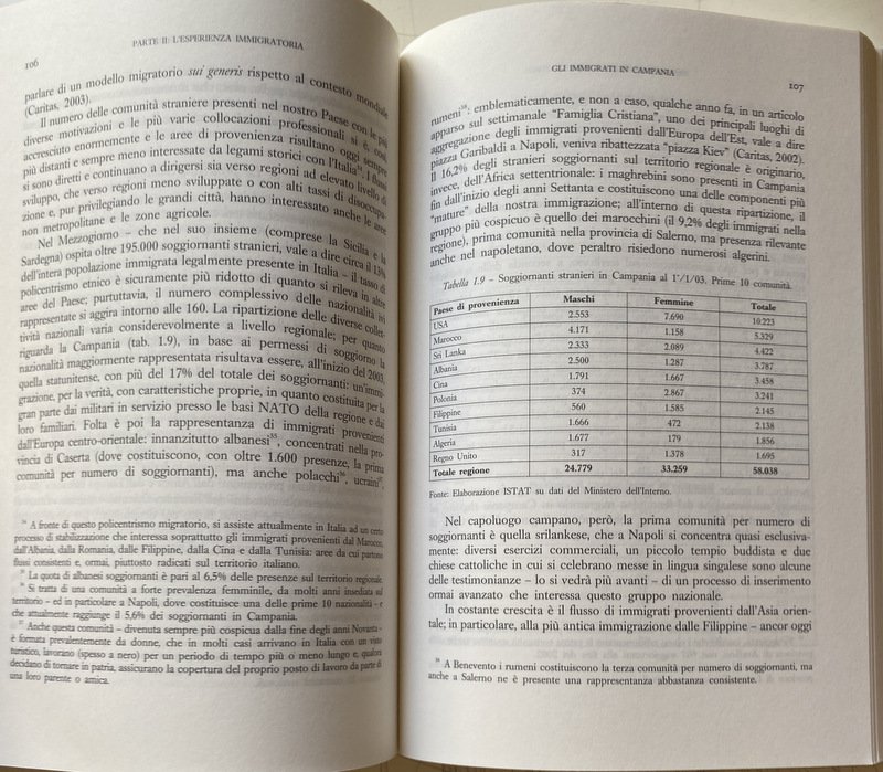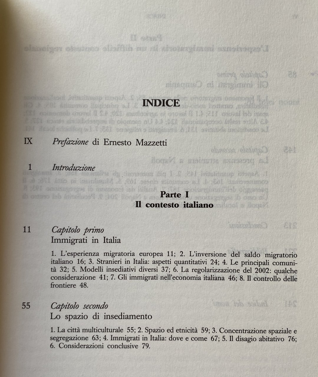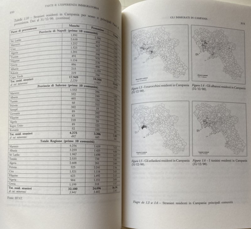 Soggetti: Geografia umana, Immigrazione, Immigrati, Integrazione, Inclusione, Città, Territorio, Multiculturalismo, Multiculturalità, Insediamento urbano, Migranti, Scienze sociali, Pianificazione, Sviluppo economico, Etnicità, Napoli, Italia, Lavoro, Occupazione, Clandestini, Lingua, Stranieri, Paesaggio, Srilankesi, Singalesi, Marocchini, Africani, Medio oriente, Libia, Filippini, Europei, Irregolari, Ambulanti, Emigrati, Residenti, Fenomeni migratori, Politica, Flussi, Sbarchi, Accoglienza, Scuola, Formazione professionale, mestieri, Colf, Badanti, Ristorante, Ristorazione, Servizi sociali, Comunità, Gruppi, Spazio, Segregazione, Razzismo, Regolarizzazione, Frontiere, Controllo, Permesso di soggiorno, Documenti, Agricoltura, Lavoro domestico, Imprenditoria etnica, Religione, Condizioni abitative, Affitti, Rom, Campi profughi, Commercianti, Commercio, Attività, Musulmani, Islam, Moschea, Velo, Donne, Radicalismo, Fondamentalismo, Centro storico, Quartieri, Statistiche, Dati, Bibliografia, Riferimento, Manuali, Consultazione, Studi culturali, Libri rari fuori catalogo autografati, Insediamenti, Demografia, Seconda generazione, Famiglia, Trasferimenti, Denaro, Rimesse, Estero, Popolazione, Unione Europea, Ucraina, Russia, Polonia, Est, Asiatici, Lavoratori, Tunisia, Capo Verde, Albanesi, Balcani, Rumeni, Romania, Moldavi, Criminalità, Armi, Droga, Spaccio, Disuguaglianza sociale, Status, Cittadinanza, Reddito, Francesco Barbagallo, Francesco Compagna, Basilicata, Calabria, Xenofobia, Jihad, Terzo Mondo, Divario, Huntington, Cina, Cinesi, Indiani, Studenti, Università, Contesto, Operai, Manodopera, Specializzazione, Tessile, Pellame, San Giuseppe Vesuviano, Sud, Salario, Giovani, Censis, Istat, Disoccupazione, Coesistenza, Malavita, Camorra, Extracomunitari, Identità, Cultura, Tradizioni, Nazionalità, Appartenenza, Bonifazi, Carlo Brusa, Scienze politiche, Germania, Caritas, Transito, Nord, Ingresso, leggi, Diritto, Diritti umani, Rifugiati, Asilo politico, Domande, Ricongiungimento, Pratiche, Assunzione, Iter, Clandestinità, Sponsor, Precariato, Contratti, Rinnovo, Regolarizzazione, NATO, Piazza Garibaldi, Porta Nolana, Salerno, Caserta, Avellino, Benevento, Provincia, Periferia, Somalia, Etiopia, Eritrea, Algeria, Edilizia, Manovalanza, Cantieri, Battipaglia, Agro-nocerino, Piana del Sele, Agropoli, Macellerie Halal, Negozi etnici, Mercatini, Inserimento, Sopravvivenza, Relazioni, Coabitazione, Sinti, Zonizzazione, Ghetti, Espulsione, Alloggio, Crisi, Globalizzazione, Viaggio, Territorio, Metropoli, Abbigliamento, Ingrosso, Bambini, Sylos, Import-export, Concorrenza sleale, Imitazioni, Marchio, Bancarelle, Stagionali, Terra di lavoro, Fragole, Pomodori, Frutta, Raccolta, Cooperative, Equo-solidale, CNEL, Bossi-Fini, Lampedusa, INPS, Pensioni, Burkina Faso, Costa d'Avorio, Grecia, Nigeria, Senegal, Made in China, Gianturco, Cinamercato, Terzigno, Ottaviano, Poggioreale, Scafati, Montecalvario, Sublocazione, Turismo, Visti, Chiaia, Barra, Stella Pendino, Avvocata, Elemosina, Slums, Baracche, Banlieues, Soggiornanti, Schede, Grafici, Provenienza, Ripartizione, Lewis Mumford, Martinelli, Stefano Allievi, Enrica Morlicchio, Pasquale Coppola, Beguinot, Marc Augé, Nonluoghi, Giddens, Gottman, Melotti, Natale, Pugliese, Sassens, Tosi, Zanfrini, Vallat, Human geography, Immigration, Immigrants, Integration, Inclusion, City, Territory, Multiculturalism, Multiculturality, Jobs, Urban settlement, Migrants, Social sciences, Planning, Economic development, Ethnicity, Naples, Italy, Employment, Illegal immigrants, Language, Foreigners, Landscape, Sri Lankans, Sinhalese, Moroccans, Africans, Middle East, Libya, Filipinos, Europeans, Irregulars, Street vendors, Emigrants, Residents, Migratory phenomena, Politics, Flows, Landings, Hospitality, School, Professional training, professions, Maids, Caregivers, Restaurant, Catering, Social services, Community, Groups, Space, Segregation, Racism, Regularization, Borders, Control, Residence permit, Documents, Agriculture, Domestic work, Ethnic entrepreneurship, Religion, Housing conditions, Rents, Refugee camps, Traders, Commerce, Activities, Muslims, Mosque, Veil, Women, Radicalism, Fundamentalism, Historic centre, Neighborhoods, Statistics, Data, Bibliography, Reference, Manuals, Consultation, Cultural studies, Rare signed out-of-print books, Settlements, Demography, Second generation, Family, Transfers, Money, Remittances, Foreign, Population, European Union, Poland, East, Asians, Workers, Cape Verde, Albanians, Balkans, Romanians, Moldovans, Crime, Weapons, Drugs, Dealing, Social inequality, Status, Citizenship, Income, Xenophobia, Third World, Gap, China, Chinese, Indians, Students, University, Context, Workers, Labor, Specialization, Textile, Leather, South, Salary, Young People, Unemployment, Coexistence, Underworld, Non-EU citizens, Identity, Culture, Traditions, Nationality, Membership, Political science, Germany, Transit, North, Entrance, laws, Law, Human rights, Refugees, Political asylum, Questions, Reunification, Practices, Recruitment, Clandestine, Precariat, Contracts, Renewal, Regularization, Province, Suburbs, Ethiopia, Construction, Laborers, Construction sites, Butchers, Ethnic shops, Markets, Insertion, Survival, Relationships, Cohabitation, Zoning, Ghettos, Expulsion, Accommodation, Crisis, Globalization, Travel, Territory, Metropolis, Clothing, Wholesale, Children, Unfair Competition, Imitations, Brand, Stalls, Seasonal, Land of Work, Strawberries, Tomatoes, Fruit, Collection, Cooperatives, Fair Trade, Pensions, Costa d Ivory, Greece, China market, Subletting, Tourism, Visas, Alms, Shacks, Stayers, Cards, Charts, Origin, Distribution