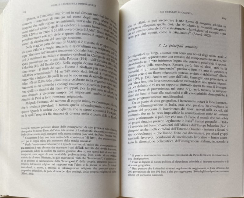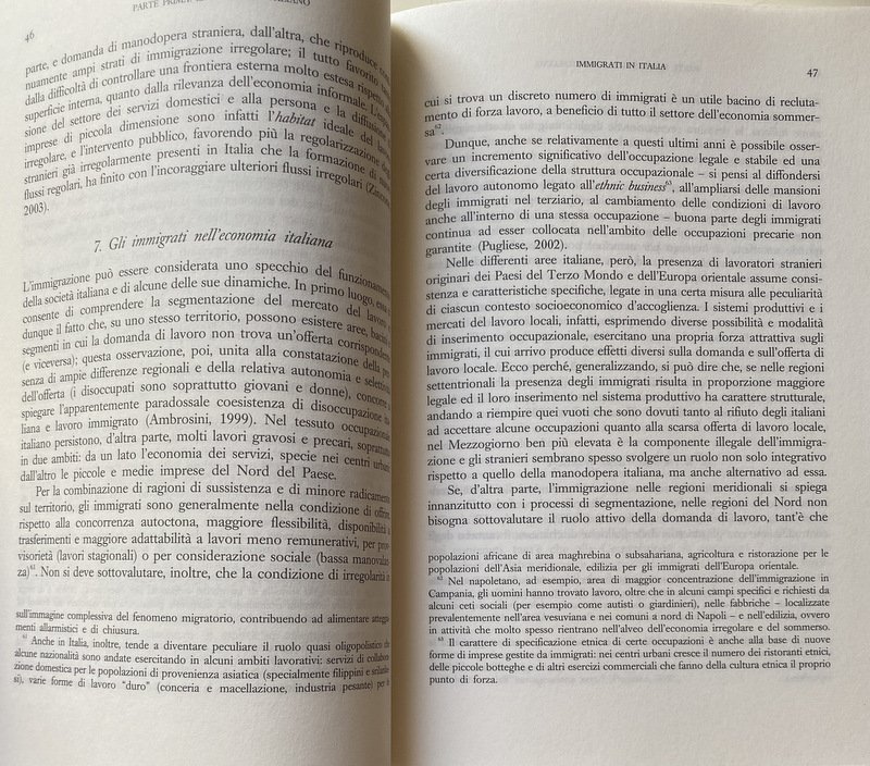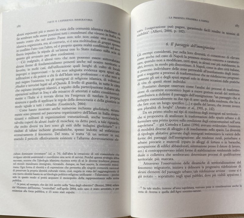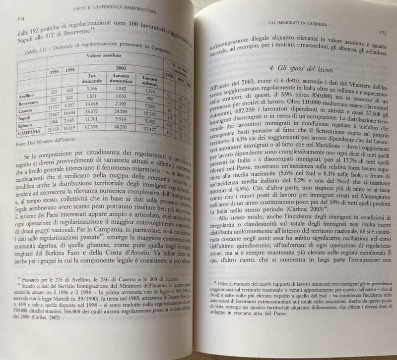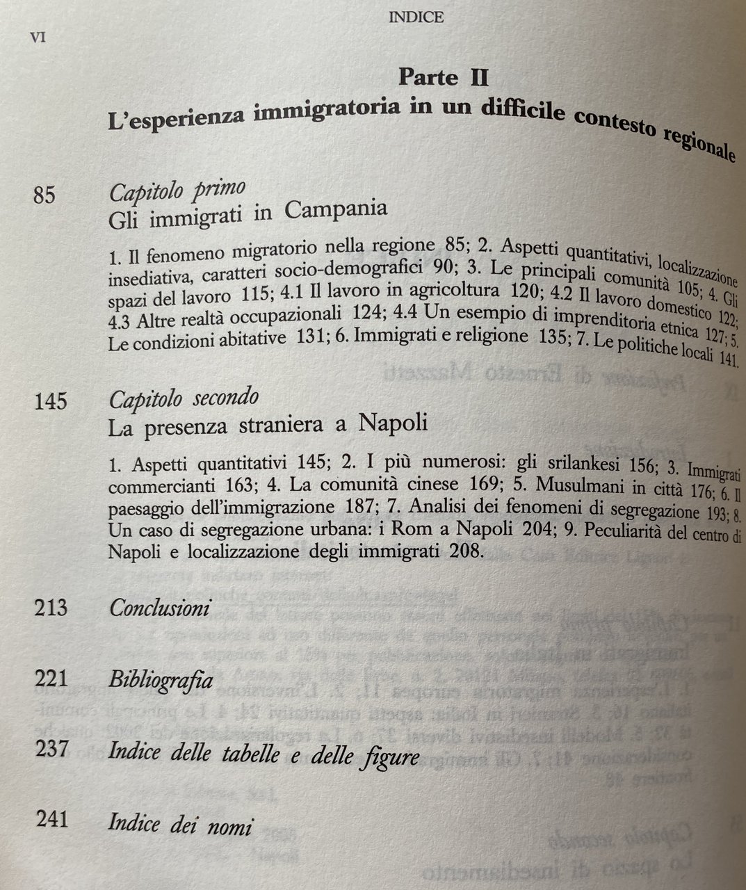 Soggetti: Geografia umana, Immigrazione, Immigrati, Integrazione, Inclusione, Città, Territorio, Multiculturalismo, Multiculturalità, Insediamento urbano, Migranti, Scienze sociali, Pianificazione, Sviluppo economico, Etnicità, Napoli, Italia, Lavoro, Occupazione, Clandestini, Lingua, Stranieri, Paesaggio, Srilankesi, Singalesi, Marocchini, Africani, Medio oriente, Libia, Filippini, Europei, Irregolari, Ambulanti, Emigrati, Residenti, Fenomeni migratori, Politica, Flussi, Sbarchi, Accoglienza, Scuola, Formazione professionale, mestieri, Colf, Badanti, Ristorante, Ristorazione, Servizi sociali, Comunità, Gruppi, Spazio, Segregazione, Razzismo, Regolarizzazione, Frontiere, Controllo, Permesso di soggiorno, Documenti, Agricoltura, Lavoro domestico, Imprenditoria etnica, Religione, Condizioni abitative, Affitti, Rom, Campi profughi, Commercianti, Commercio, Attività, Musulmani, Islam, Moschea, Velo, Donne, Radicalismo, Fondamentalismo, Centro storico, Quartieri, Statistiche, Dati, Bibliografia, Riferimento, Manuali, Consultazione, Studi culturali, Libri rari fuori catalogo autografati, Insediamenti, Demografia, Seconda generazione, Famiglia, Trasferimenti, Denaro, Rimesse, Estero, Popolazione, Unione Europea, Ucraina, Russia, Polonia, Est, Asiatici, Lavoratori, Tunisia, Capo Verde, Albanesi, Balcani, Rumeni, Romania, Moldavi, Criminalità, Armi, Droga, Spaccio, Disuguaglianza sociale, Status, Cittadinanza, Reddito, Francesco Barbagallo, Francesco Compagna, Basilicata, Calabria, Xenofobia, Jihad, Terzo Mondo, Divario, Huntington, Cina, Cinesi, Indiani, Studenti, Università, Contesto, Operai, Manodopera, Specializzazione, Tessile, Pellame, San Giuseppe Vesuviano, Sud, Salario, Giovani, Censis, Istat, Disoccupazione, Coesistenza, Malavita, Camorra, Extracomunitari, Identità, Cultura, Tradizioni, Nazionalità, Appartenenza, Bonifazi, Carlo Brusa, Scienze politiche, Germania, Caritas, Transito, Nord, Ingresso, leggi, Diritto, Diritti umani, Rifugiati, Asilo politico, Domande, Ricongiungimento, Pratiche, Assunzione, Iter, Clandestinità, Sponsor, Precariato, Contratti, Rinnovo, Regolarizzazione, NATO, Piazza Garibaldi, Porta Nolana, Salerno, Caserta, Avellino, Benevento, Provincia, Periferia, Somalia, Etiopia, Eritrea, Algeria, Edilizia, Manovalanza, Cantieri, Battipaglia, Agro-nocerino, Piana del Sele, Agropoli, Macellerie Halal, Negozi etnici, Mercatini, Inserimento, Sopravvivenza, Relazioni, Coabitazione, Sinti, Zonizzazione, Ghetti, Espulsione, Alloggio, Crisi, Globalizzazione, Viaggio, Territorio, Metropoli, Abbigliamento, Ingrosso, Bambini, Sylos, Import-export, Concorrenza sleale, Imitazioni, Marchio, Bancarelle, Stagionali, Terra di lavoro, Fragole, Pomodori, Frutta, Raccolta, Cooperative, Equo-solidale, CNEL, Bossi-Fini, Lampedusa, INPS, Pensioni, Burkina Faso, Costa d'Avorio, Grecia, Nigeria, Senegal, Made in China, Gianturco, Cinamercato, Terzigno, Ottaviano, Poggioreale, Scafati, Montecalvario, Sublocazione, Turismo, Visti, Chiaia, Barra, Stella Pendino, Avvocata, Elemosina, Slums, Baracche, Banlieues, Soggiornanti, Schede, Grafici, Provenienza, Ripartizione, Lewis Mumford, Martinelli, Stefano Allievi, Enrica Morlicchio, Pasquale Coppola, Beguinot, Marc Augé, Nonluoghi, Giddens, Gottman, Melotti, Natale, Pugliese, Sassens, Tosi, Zanfrini, Vallat, Human geography, Immigration, Immigrants, Integration, Inclusion, City, Territory, Multiculturalism, Multiculturality, Jobs, Urban settlement, Migrants, Social sciences, Planning, Economic development, Ethnicity, Naples, Italy, Employment, Illegal immigrants, Language, Foreigners, Landscape, Sri Lankans, Sinhalese, Moroccans, Africans, Middle East, Libya, Filipinos, Europeans, Irregulars, Street vendors, Emigrants, Residents, Migratory phenomena, Politics, Flows, Landings, Hospitality, School, Professional training, professions, Maids, Caregivers, Restaurant, Catering, Social services, Community, Groups, Space, Segregation, Racism, Regularization, Borders, Control, Residence permit, Documents, Agriculture, Domestic work, Ethnic entrepreneurship, Religion, Housing conditions, Rents, Refugee camps, Traders, Commerce, Activities, Muslims, Mosque, Veil, Women, Radicalism, Fundamentalism, Historic centre, Neighborhoods, Statistics, Data, Bibliography, Reference, Manuals, Consultation, Cultural studies, Rare signed out-of-print books, Settlements, Demography, Second generation, Family, Transfers, Money, Remittances, Foreign, Population, European Union, Poland, East, Asians, Workers, Cape Verde, Albanians, Balkans, Romanians, Moldovans, Crime, Weapons, Drugs, Dealing, Social inequality, Status, Citizenship, Income, Xenophobia, Third World, Gap, China, Chinese, Indians, Students, University, Context, Workers, Labor, Specialization, Textile, Leather, South, Salary, Young People, Unemployment, Coexistence, Underworld, Non-EU citizens, Identity, Culture, Traditions, Nationality, Membership, Political science, Germany, Transit, North, Entrance, laws, Law, Human rights, Refugees, Political asylum, Questions, Reunification, Practices, Recruitment, Clandestine, Precariat, Contracts, Renewal, Regularization, Province, Suburbs, Ethiopia, Construction, Laborers, Construction sites, Butchers, Ethnic shops, Markets, Insertion, Survival, Relationships, Cohabitation, Zoning, Ghettos, Expulsion, Accommodation, Crisis, Globalization, Travel, Territory, Metropolis, Clothing, Wholesale, Children, Unfair Competition, Imitations, Brand, Stalls, Seasonal, Land of Work, Strawberries, Tomatoes, Fruit, Collection, Cooperatives, Fair Trade, Pensions, Costa d Ivory, Greece, China market, Subletting, Tourism, Visas, Alms, Shacks, Stayers, Cards, Charts, Origin, Distribution