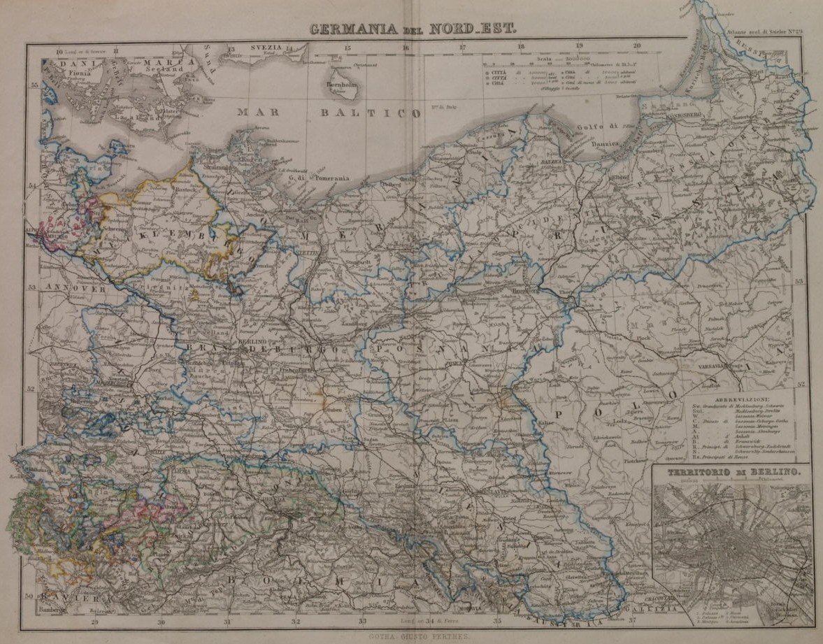 Bella incisione su rame colorata del 1880 tratta dall'opera "Atlante scolastico per la geografia politica e fisica di Ad. Stieler ed Erm. Berghaus". L'incisione rappresenta la Germania del Nord Est: Boemia, Brandeburgo, Posnania, Prussia. Nella parte inferiore il territorio di Berlino. INCISIONE: Incisione su rame DIMENSIONI FOGLIO: cm 31,5x24,5 DIMENSIONI INCISIONE: cm 24x19 EPOCA: 1880 CONDIZIONI: Ottime. Piegatura verticale. Very beautiful copper engraving of 1880 taken from the historical work "Atlante scolastico per la geografia politica e fisica di Ad. Stieler ed Erm. Berghaus". View of North West Germany: Boemia, Brandeburgo, Posnania, Prussia In the lower part the area of Berlin. ENGRAVING: copper plate LEAF DIMENSION: 31,5x24,5 ENGRAVING DIMENSION: cm 24x19 DATE: 1880 CONDITIONS: Very good conditions. Vertical folding.