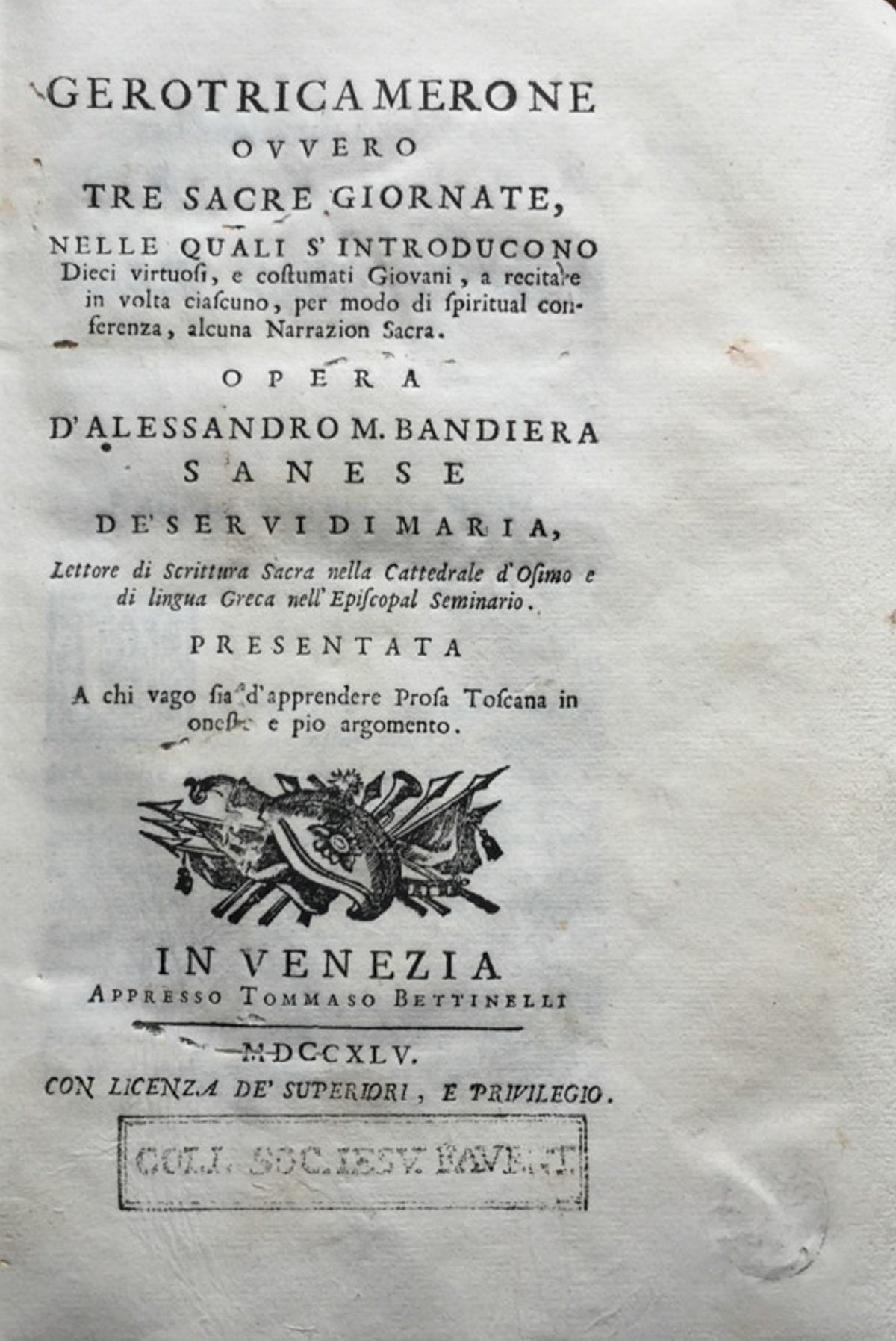 Venezia, Tommaso Bettinelli, in 8vo. Legatura editoriale muta, 322 pp. Opera di Alessandro Bandiera Sanese [1699 - 1770 ca] Lettore di Scrittura Sacra nella Cattedrale d'Osimo e di lingua Greca nell'Episcopal Seminario, presentata a chi vago sia d'apprendere Prosa Toscana in onesto e pio argomento. Nel frontespizio incisione raffigurante armi e bandiere militari. Timbro della Società di Gesù di Faenza al frontespizio. Segni di tarlo ai piatti e alle prime ed ultime pagine. L'ammirazione per la lingua del Boccaccio e il moralismo lo spinsero il Bandiera a comporre il Gerotricamerone, una raccolta di trenta novelle recitate da dieci costumati giovani in tre giornate. La raccolta suscitò fra l'altro l'ironia del Parini, che definì il titolo -- procelloso e sesquipedale --, provocando la risentita risposta del Bandiera. 853 - V In Ottavi (15-23cm ) Mediocre (Poor) Accettabile