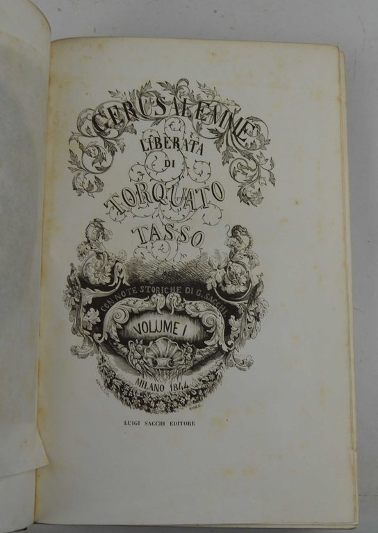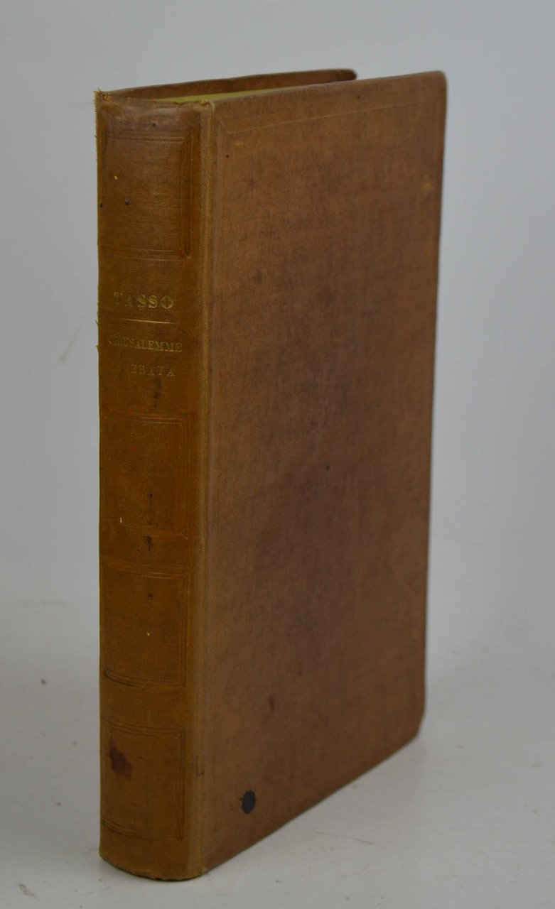Due parti in un volume di cm. 26, pp. (4) xciv (2) 278 + 1 cb.; 384. Con 2 tavole geografiche fuori testo e moltissime, fini incisioni xilografiche e fregi decorativi nel testo. Legatura coeva in piena percallina con titoli in oro al dorso. Una cerniera esperna con un piccolo indebolimento alla parte alta, peraltro esemplare genuino ed in buono stato di conservazione, stampato su carta distinta. Elegante edizione della “Gerusalemme liberata” che presenta degli aspetti sorprendentemente innovativi dal punto di vista tipografico ricercando nuovi equilibri tra il testo e le figure. Senz’altro una delle più apprezzabili edizioni ottocentesche di questo classico tassiano.