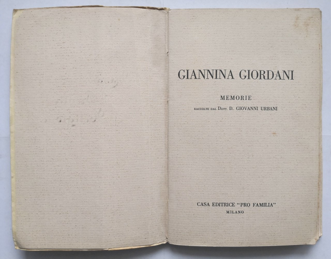 GIANNINA GIORDANI memorie di Giovanni Urbani 1931 Editrice Pro Familia Libro
