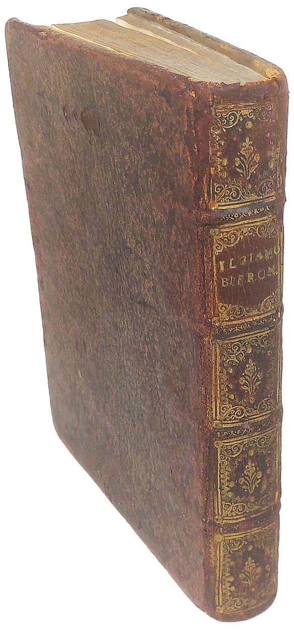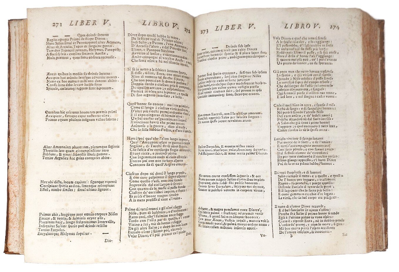 >in-4, pp. (12), 806 colonne; legatura coeva in piena pelle, titolo e fregi in oro al dorso. Questa traduzione uscì per la prima volta a Lucca nel 1680. La presente edizione ''è fatta con molto decoro e data fuori dal padre Alessandro del Poggio, col testo latino a fronte, Gli Argomenti in ottava rima sono di Donato Ant. Leonardi...''. Fu assai stimata dal Redi e il Gravina la ritenne superiore a tutte per la piacevolezza dell'armonia (Gamba, Testi di lingua). Buon esemplare (nota di possesso d'epoca di "Gaetano Fiorini" al contropiatto. Gamba, 2109: ''fatta con molto decoro''.