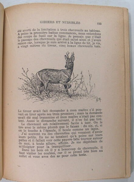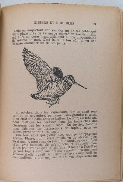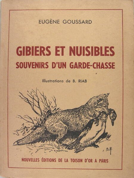 Nouvelles Editions de la Toison d’Or, Paris, 1952. In/8 broché, couverture illustrée, 190 pages, nombreuses illustrations dans le texte en noir de B. Riab. Edition originale. Souvenirs d’un garde-chasse faisant défilé une belle brochette d’animaux nuisibles (belette, faucon, putois, geai, fouine, rat, loir.) ; mais aussi les procédés utilisés par les braconniers ; le gibier (bécasse, caille, lapin, faisan, vanneau.), etc. Kaps, p. 97.