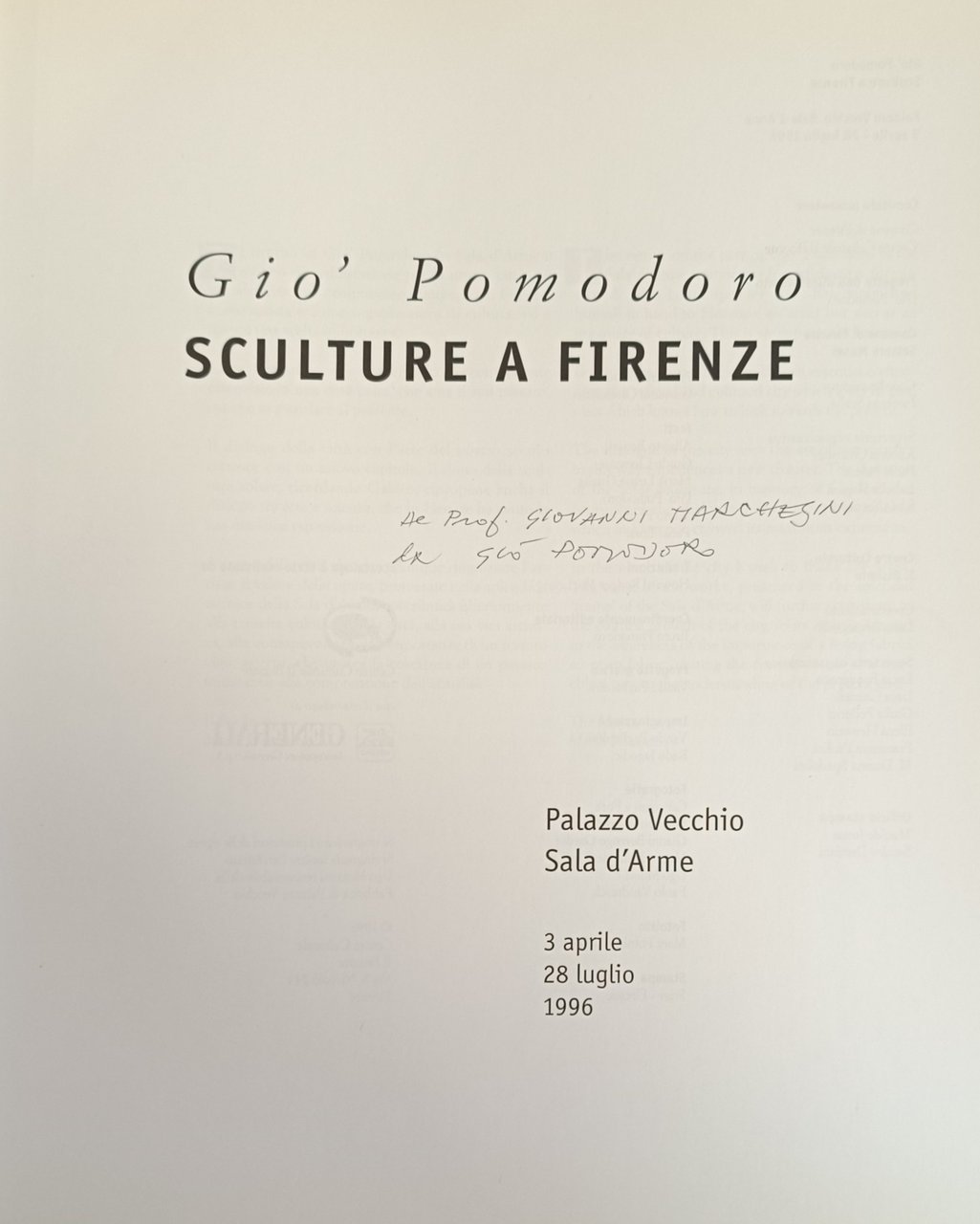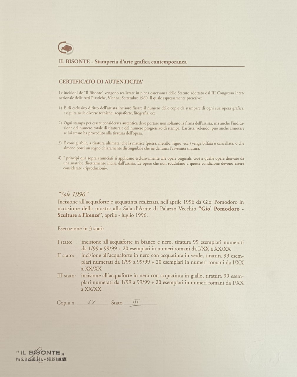 È presente l'incisione "Sole 1996" - acquaforte e acquatinta all'antiporta estraibile (tiratura XX/XX - stato III), firmata a matita in basso a destra, realizzata dall'artista in occasione della mostra inerente il catalogo. Presente anche sua autentica timbrata e firmata dalla galleria Il Bisonte. in quarto leg. cart. pp. 158 Molto buono (Very Good) Es. molto buono, dedica e firma dell'artista al frontespizio.