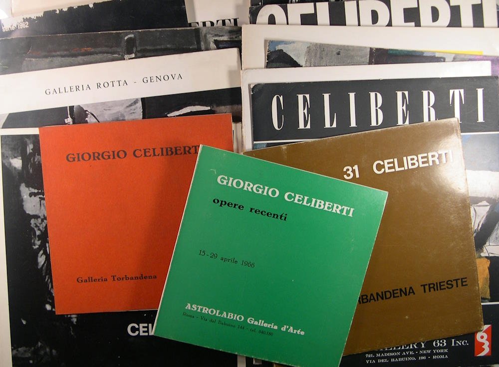Ensemble de 19 plaquettes et catalogues d’exposition (1960 à 1969) ainsi que des coupures de journaux sur cet artiste Italien ; expositions à Rome, Gênes, Milan, Padoue, Trieste, Turin. Belle ensemble dans les galeries L'Obelisco 1961, galerie 63 inc. 1963, trois catalogue de chez Torbandena, l'Approdo galerie d'art moderne 1965, galerie d'art Zanini Rome 1969, galerie d'art Sagittaria, galerie Rotta, 1962, galerie Bergamini 1962, . + un ouvrage de Marcello Venturoli sur Celiberti de 1964. Ensemble en Italien. "Né en Udine en 1929, en 1948, il a étudié avec Emilio Vedova. Au début des années cinquante, il s'installe à Paris puis Bruxelles. Exposition internationale d'art de Venise 1948, 1950, le 150e anniversaire de l'unification italienne en 2011 par Bruno Mauresing. également participations à 5 quadriennale de Rome entre 1952, différentes expositions comme celle de la nouvelle peinture italienne au Musée Kumakura au Japon, ainsi que de nombreuses autres expositions à l'étranger. En 1963, une de ses oeuvres est exposée à Peintures contemporaines italienne, mis en place dans certaines villes australien. En 2003, il a remporté le Premio Sulmona, consacrés dans plusieurs musées comme celui de Palazzo dei Diamanti à Ferrare en 1989, au Grand Palais à Paris en 1989, la rétrospective à la Villa Musée de Breda à Padoue en 2005, celui de 2010 2009- quatre-vingts ans de l'enseignant au Musée juif de Venise, l'exposition Giorgio Celiberti, la spectacle « passion et le corps de l'histoire », réalisée entre 2014 et 2015 Musée national de Ravenne."