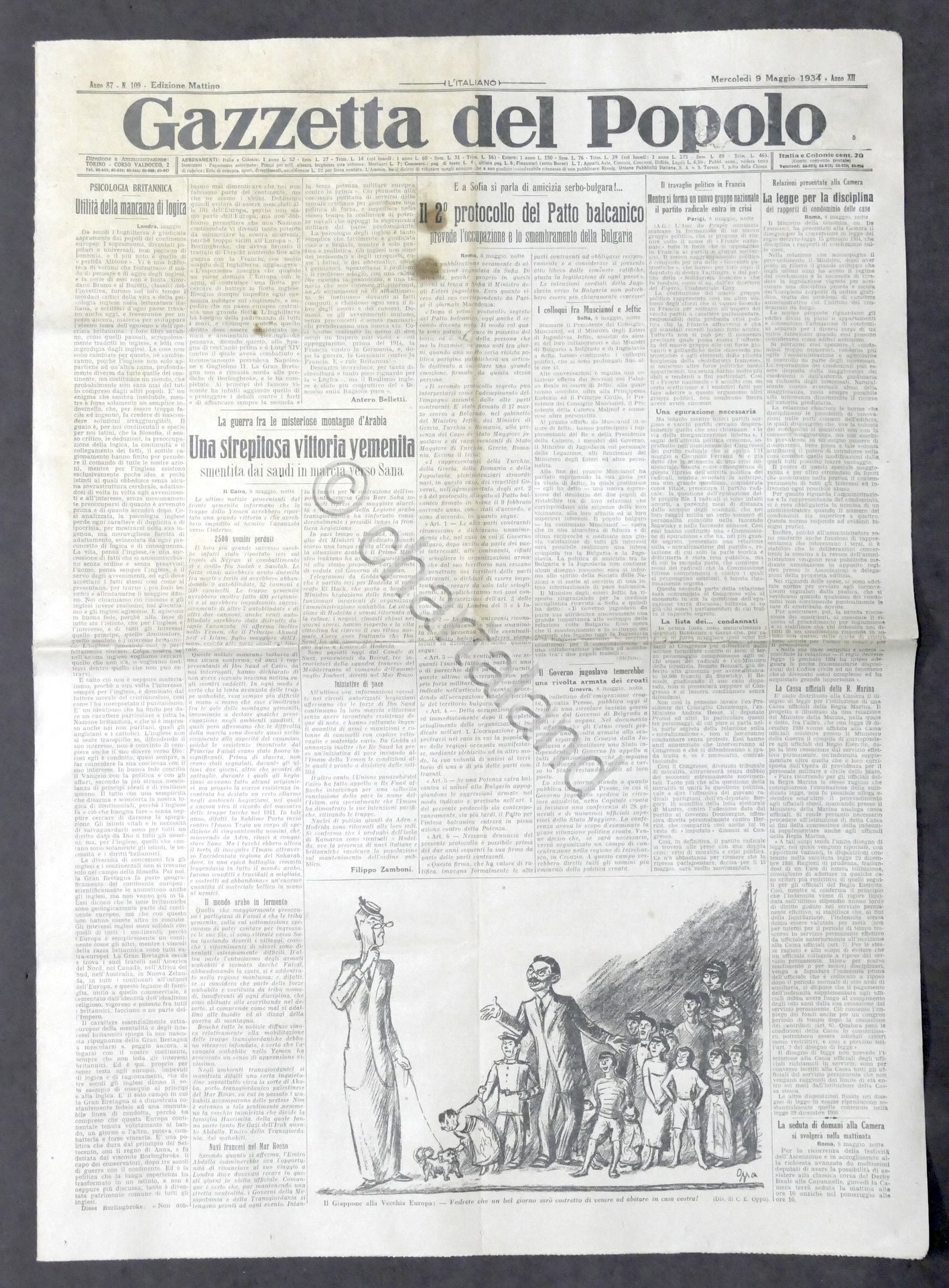 Giornale - Gazzetta del Popolo N. 109 - 2^ Protocollo del Patto balcanico - 1934 Testo in lingua italiana, Pag. 8 Condizioni buone come da foto