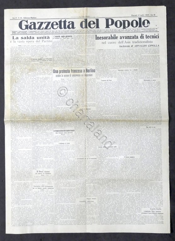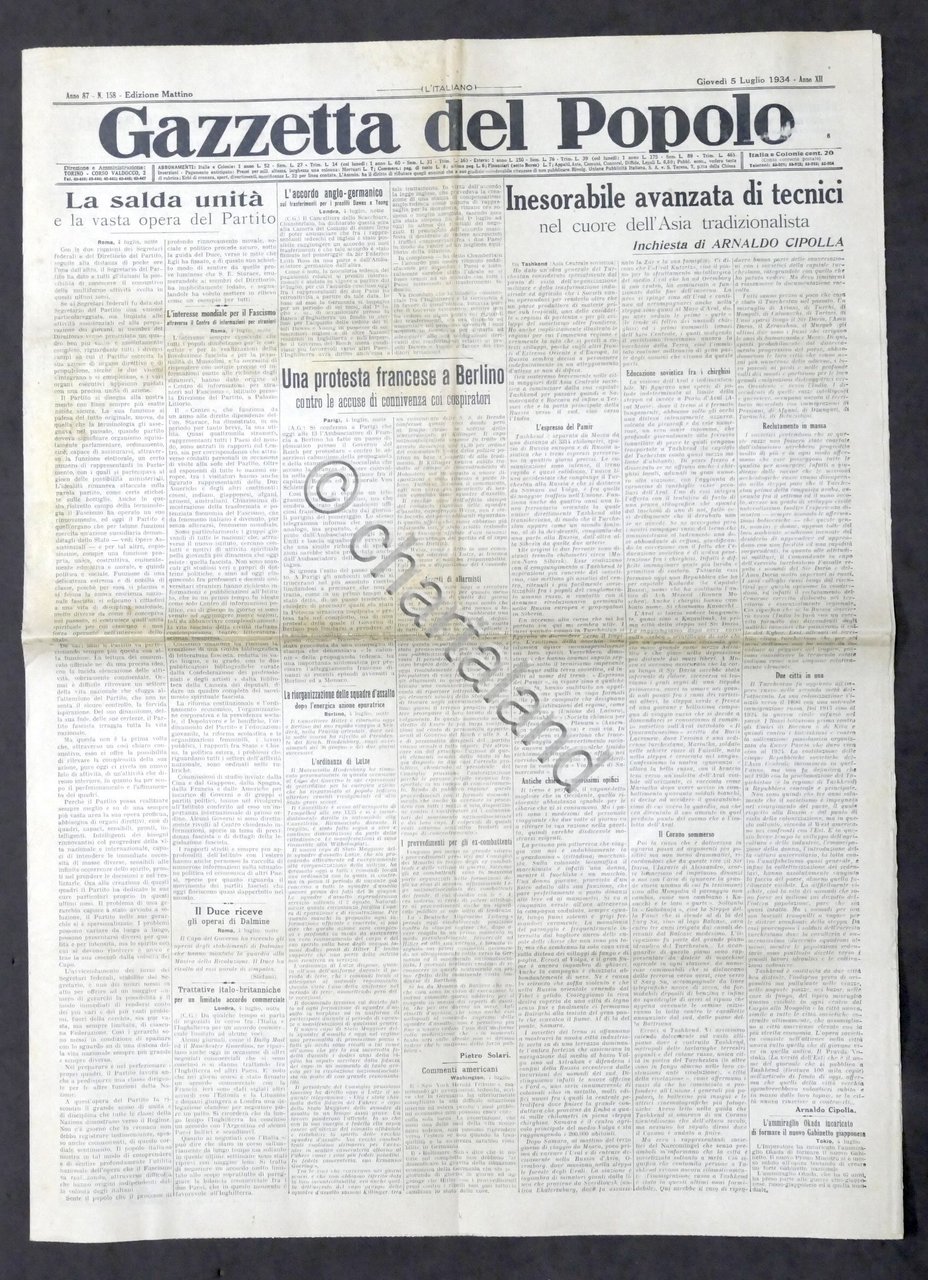 Giornale - Gazzetta del Popolo N. 158 - Una protesta francese a Berlino - 1934 Testo in lingua italiana, Pag. 8 Condizioni buone come da foto