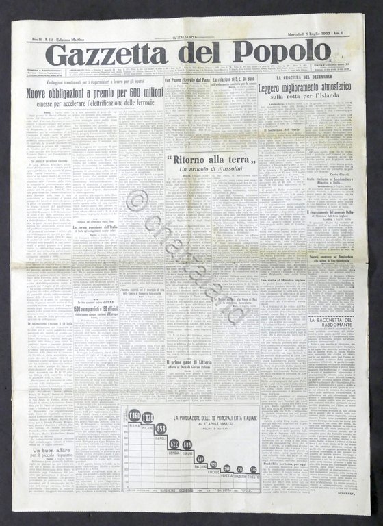 Giornale - Gazzetta del Popolo N. 158 - Obbligazioni a premio per 600 milioni - 1933 Testo in lingua italiana, Pag. 8 con illustrazioni Condizioni buone