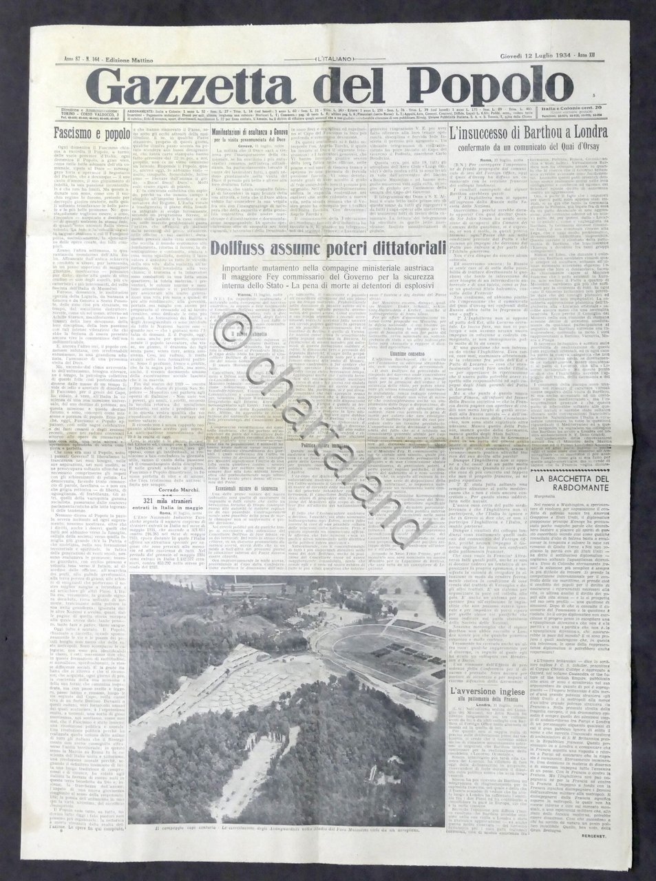 Giornale - Gazzetta del Popolo N. 164 - L'insuccesso di Barthou a Londra - 1934 Testo in lingua italiana, Pag. 8 Condizioni buone come da foto