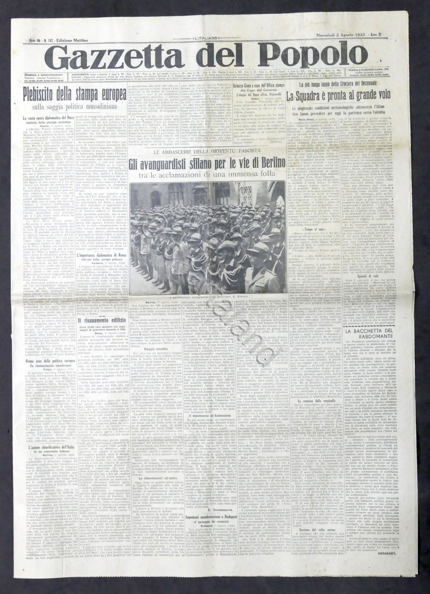 Giornale - Gazzetta del Popolo N. 182 - Gli avanguardisti sfilano per le vie di Berlino - 1933 Testo in lingua italiana, Pag. 8 con illustrazioni Condizioni buone