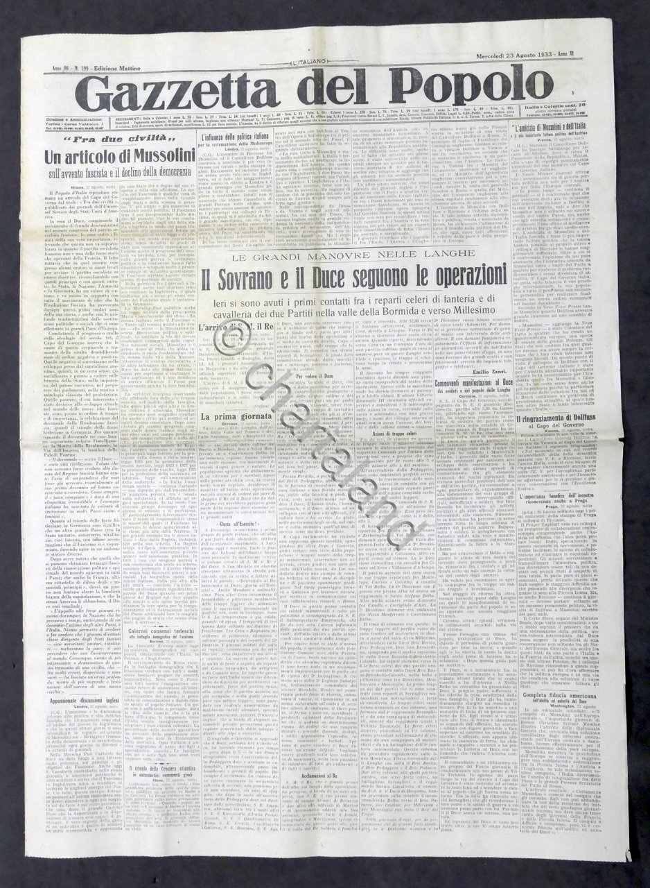 Giornale - Gazzetta del Popolo N. 199 - Un articolo di Mussolini - 1933 Testo in lingua italiana, Pag. 8 Condizioni buone come da foto