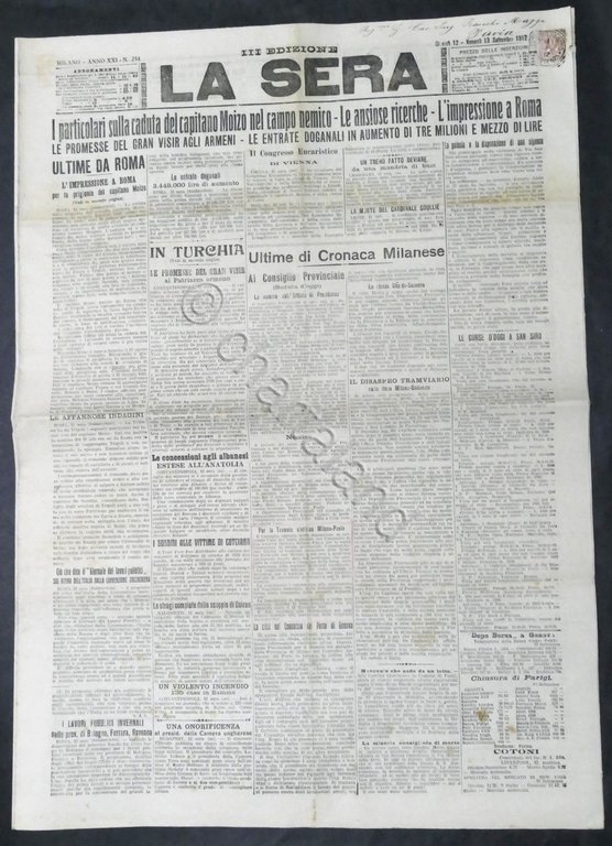 Giornale - La Sera - Anno XXI - N. 254 - 1912 Caduta capitano Moizo campo nemico