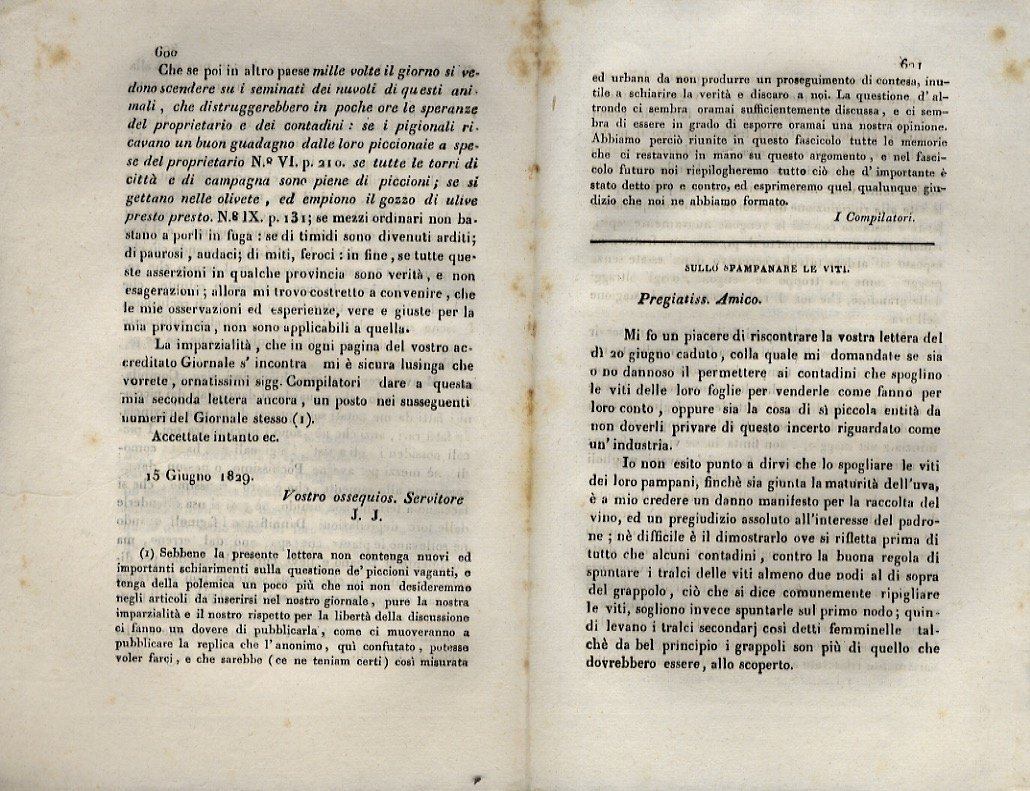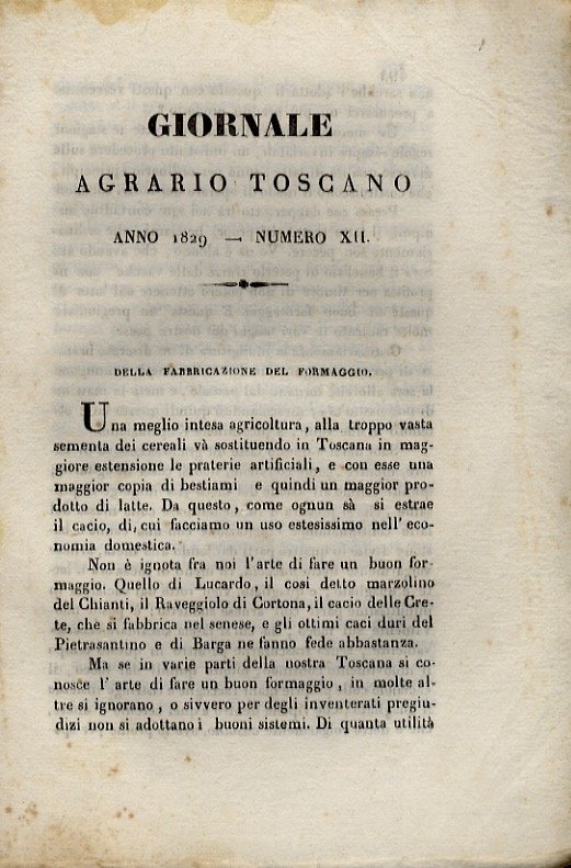Firenze, al Gabinetto Scientifico e Letterario di G.P. Vieusseux, 1829, in-8, privo di brossura, pp. numerate da 485 a 644 (su 660). Sciolto. Fra le varie memorie contenute segnaliamo: “Della fabbricazione del formaggio” di G. Vai, “Sull'utilità dei castagni” di P.C. Pananti, “Sui piccioni vaganti” dei Compilatori, “Sullo spampanare le viti” di A. Bellucci, ecc.