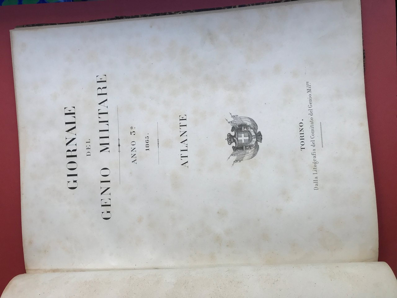 In-folio, frontespizio, 24 tavv. in itografia f.t. su doppia pagina rappresentanti Caserme Italiane e straniere, mappe strategiche, oggetti militari, legatura in mezza pelle titolo in oro al d. Giornale del Genio Militare Atlante: La storia negli anni dei progetti di caserme militari, rappresentazioni di prove balistiche di armi da fuoco, rappresentazione di oggetti e strumenti di utilizzo militare del periodo interessato