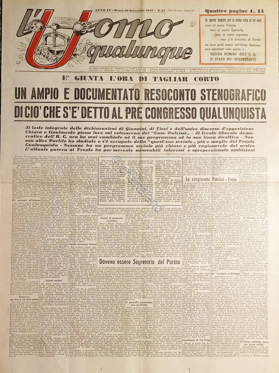 Giornale di G. Giannini - L'Uomo qualunque N. 37 - Congresso Qualunquista - 1947