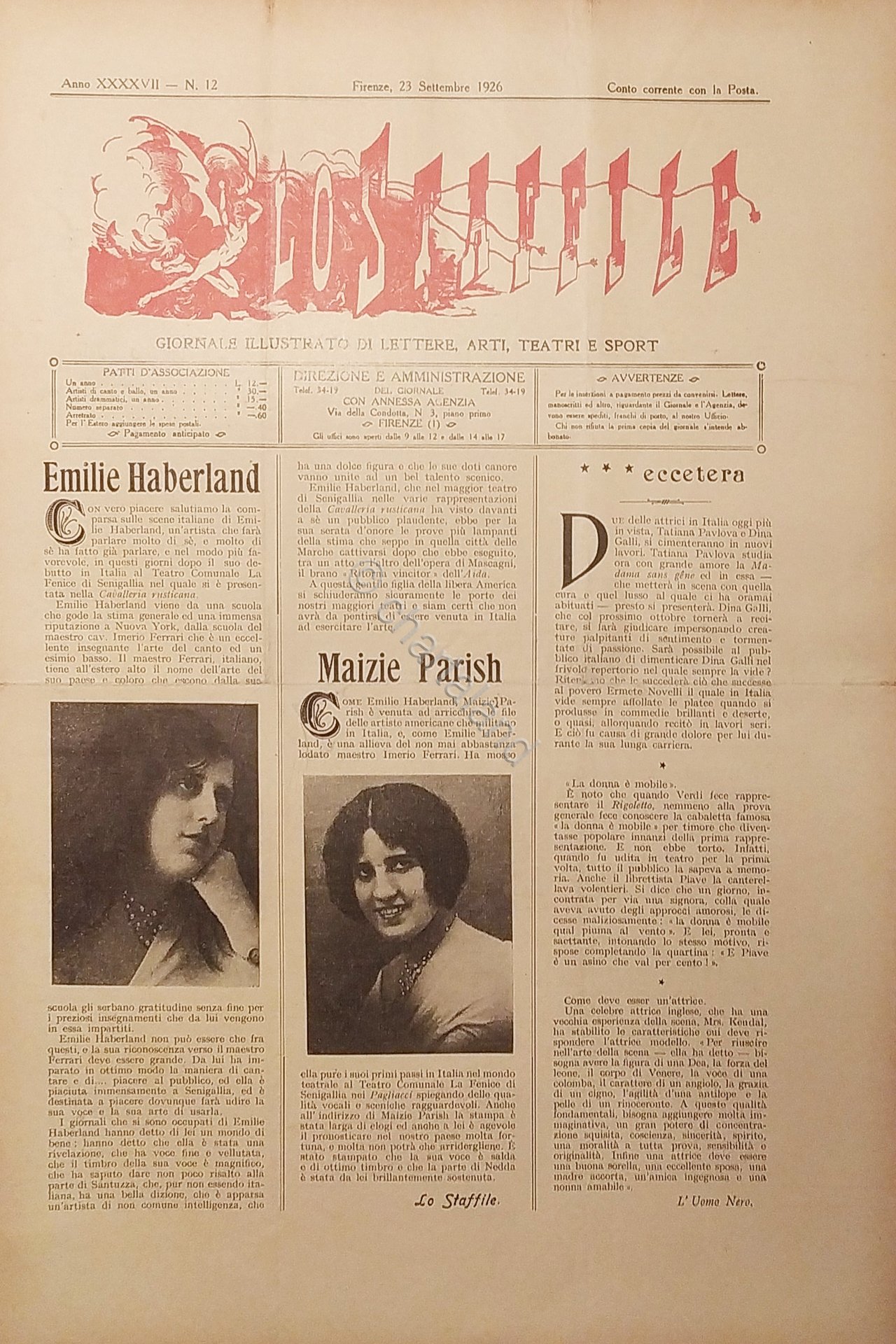 Giornale di Teatri Lettere e Arti - Lo Staffile N. 12 - Maizie Parish - 1926 Testo in lingua italiana. Pagine 4 con illustrazioni. Condizioni molto buone.