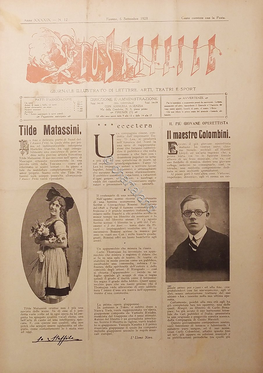 Giornale di Teatri Lettere e Arti - Lo Staffile N. 12 - Tilde Matassini - 1928 Testo in lingua italiana. Pagine 4 con illustrazioni. Condizioni molto buone.