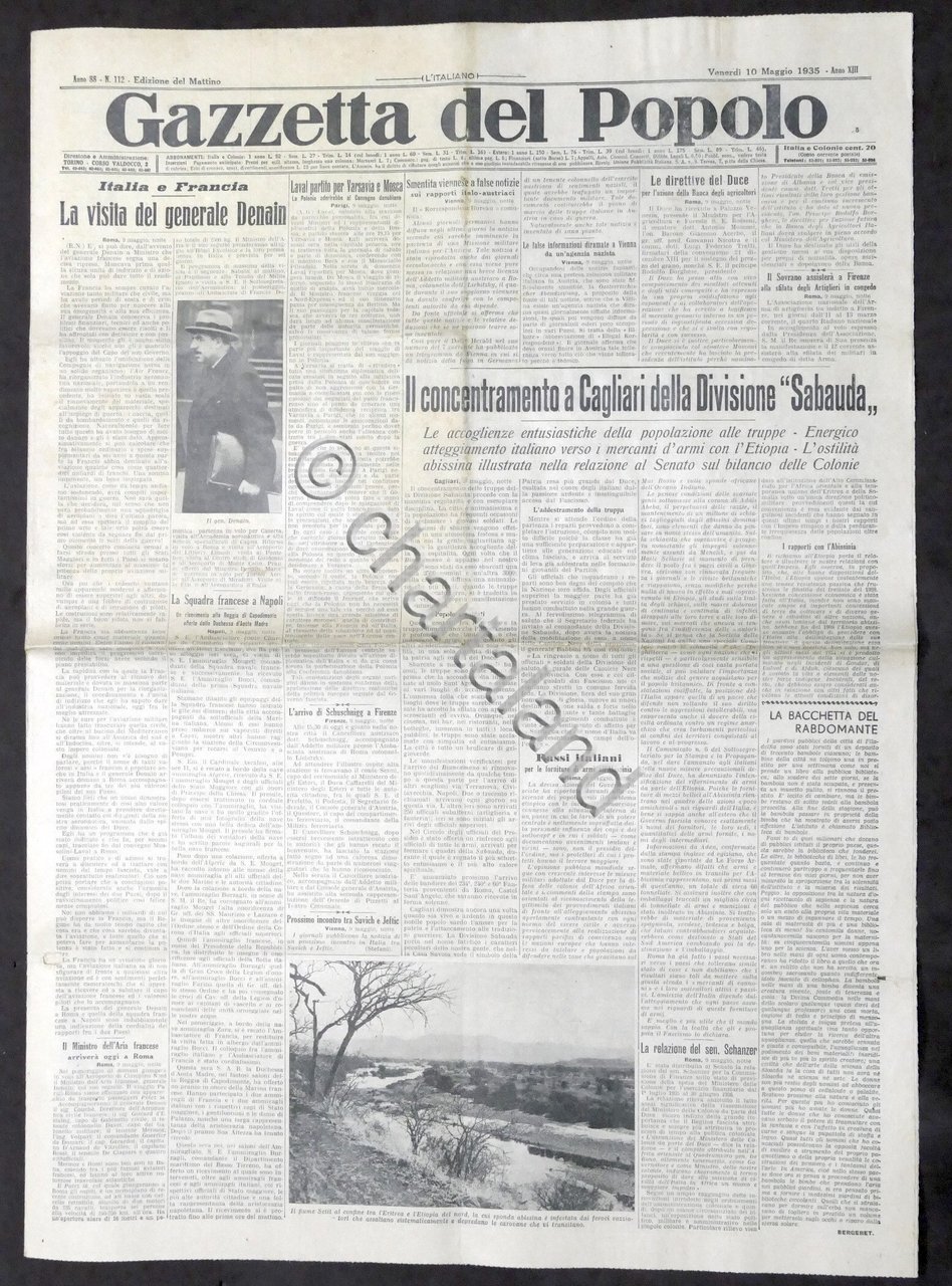 Giornale Gazzetta del Popolo N. 112 - La visita del Generale Denain - 1935 Testo in lingua italiana, Pag. 8 con illustrazioni Condizioni buone