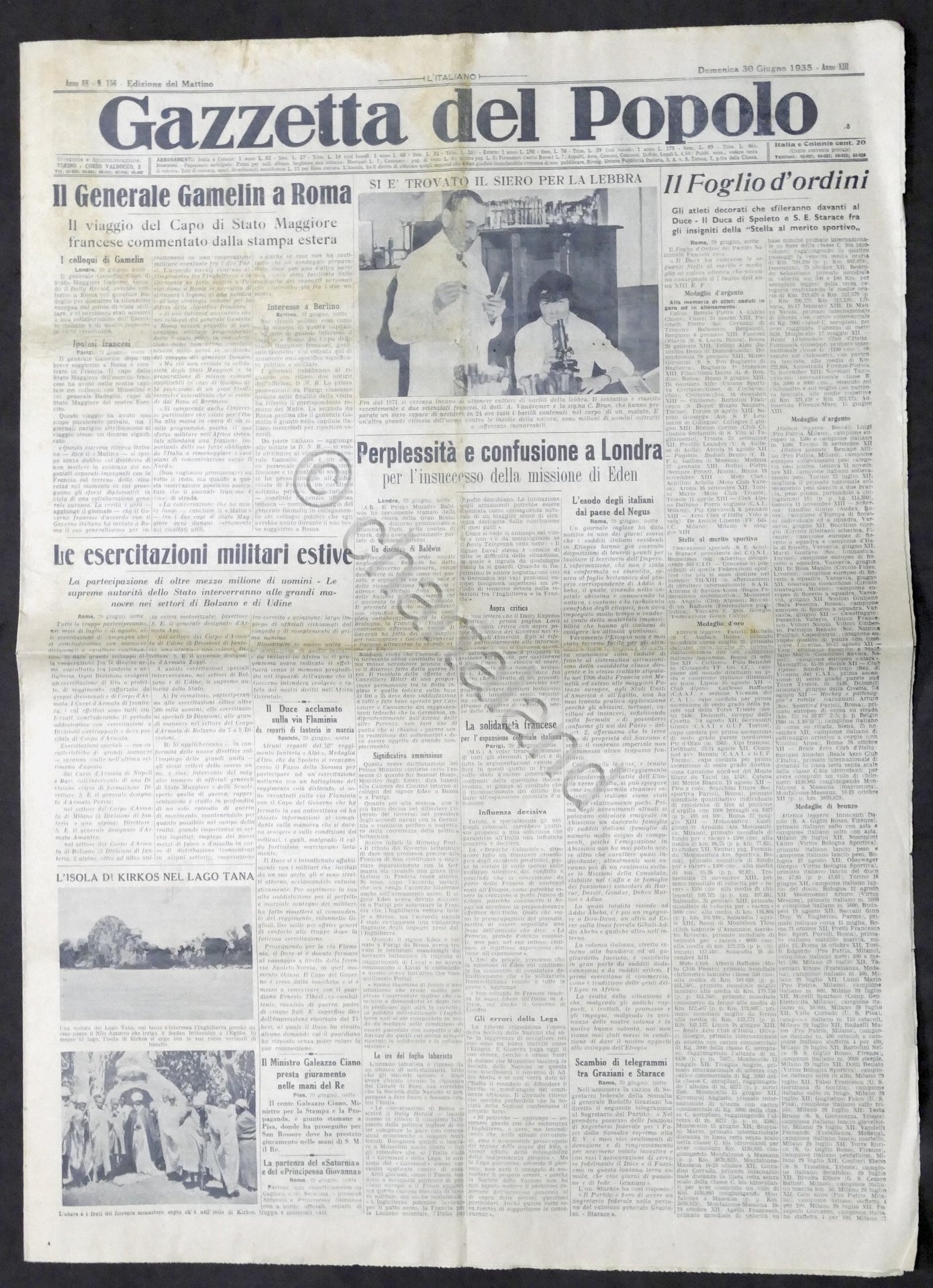 Giornale Gazzetta del Popolo N. 156 - Il Generale Gamelin a Roma - 1935 Testo in lingua italiana, Pag. 8 con illustrazioni Condizioni buone