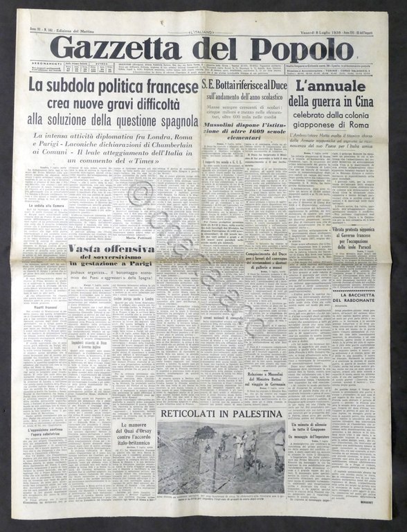 Giornale Gazzetta del Popolo N. 161 - L'annuale della guerra in Cina - 1938