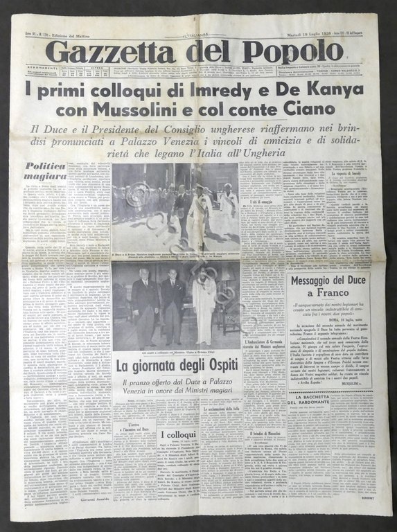 Giornale Gazzetta del Popolo N. 170 - I primi colloqui di Imredy e De Kanya con Mussolini e col Conte Ciano - 1938 Testo in lingua italiana, Pag. 6 con illustrazioni Condizioni buone