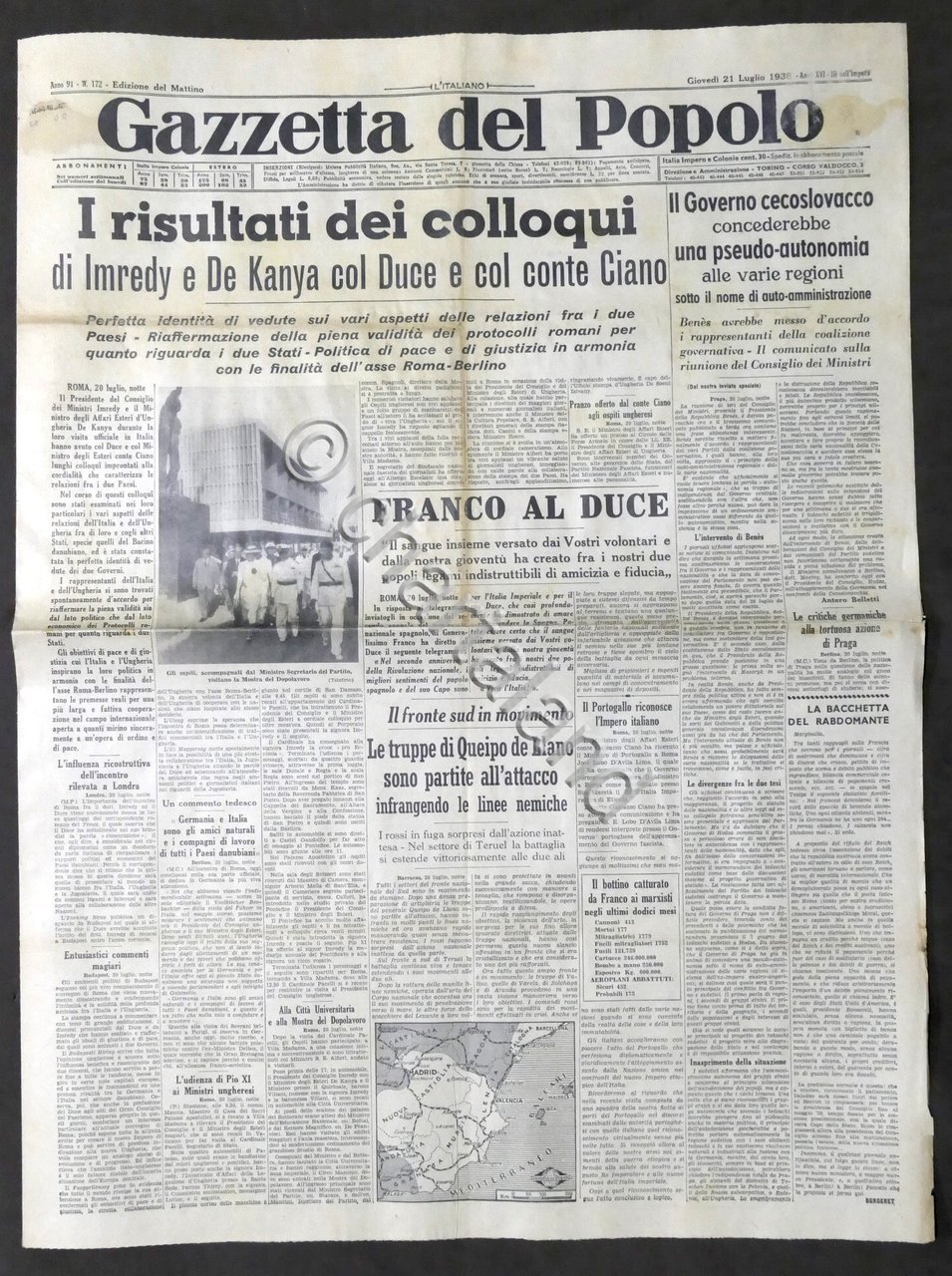 Giornale Gazzetta del Popolo N. 172 - I risultati dei colloqui di Imredy e De Kanya col Duce e col Conte Ciano - 1938 Testo in lingua italiana, Pag. 6 con illustrazioni Condizioni buone