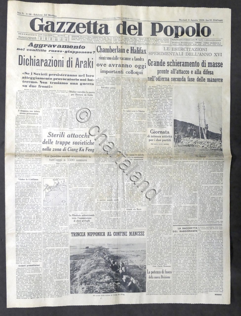 Giornale Gazzetta del Popolo N. 188 Aggravamento conflitto russo giapponese 1938