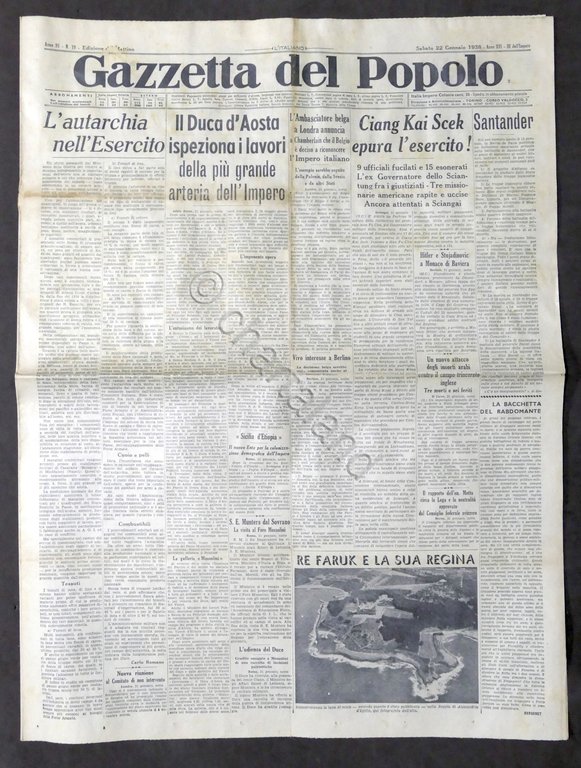 Giornale Gazzetta del Popolo N. 19 - Il Duca d'Aosta ispeziona i lavori - 1938 Testo in lingua italiana, Pag. 6 con illustrazioni Condizioni buone
