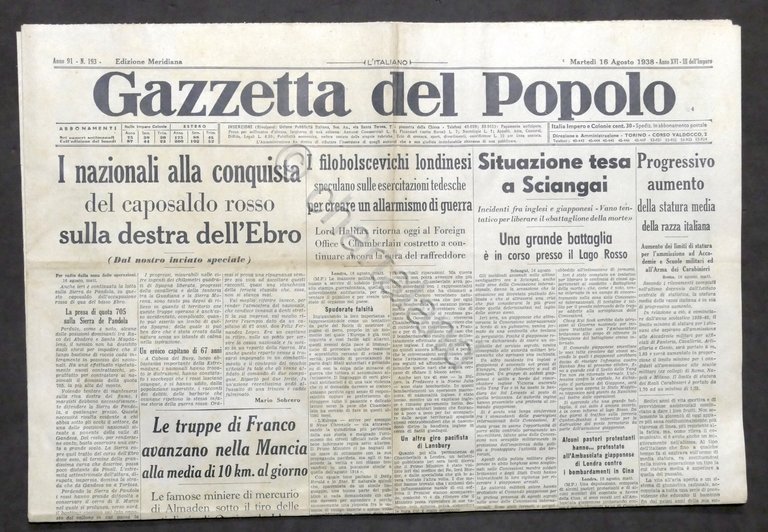 Giornale Gazzetta del Popolo N. 193 Merid. - Situazione tesa a Shanghai - 1938