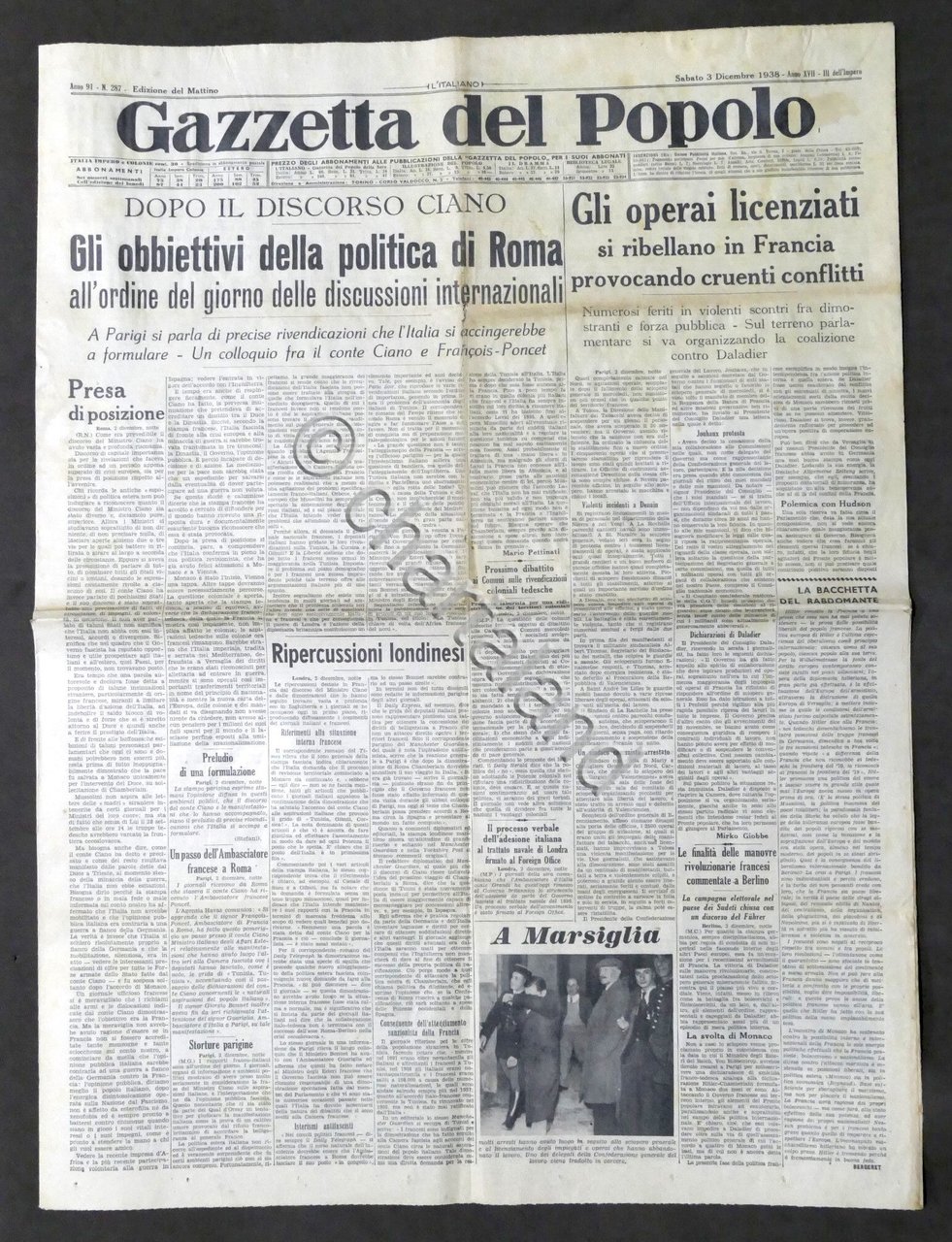 Giornale Gazzetta del Popolo N. 287 - Gli obiettivi della politica di Roma 1938 Testo in lingua italiana, Pag. 6 con illustrazioni Condizioni buone