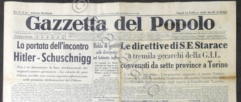 Giornale Gazzetta del Popolo N. 38 - La portata dell'incontro Hitler - Schischnigg - 1938 Testo in lingua italiana, Pag. 6 con illustrazioni Condizioni buone