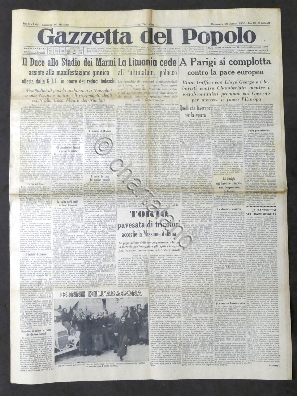 Giornale Gazzetta del Popolo N. 68 - Il Duce allo Stadio dei Marmi - 1938 Testo in lingua italiana, Pag. 6 con illustrazioni Condizioni buone