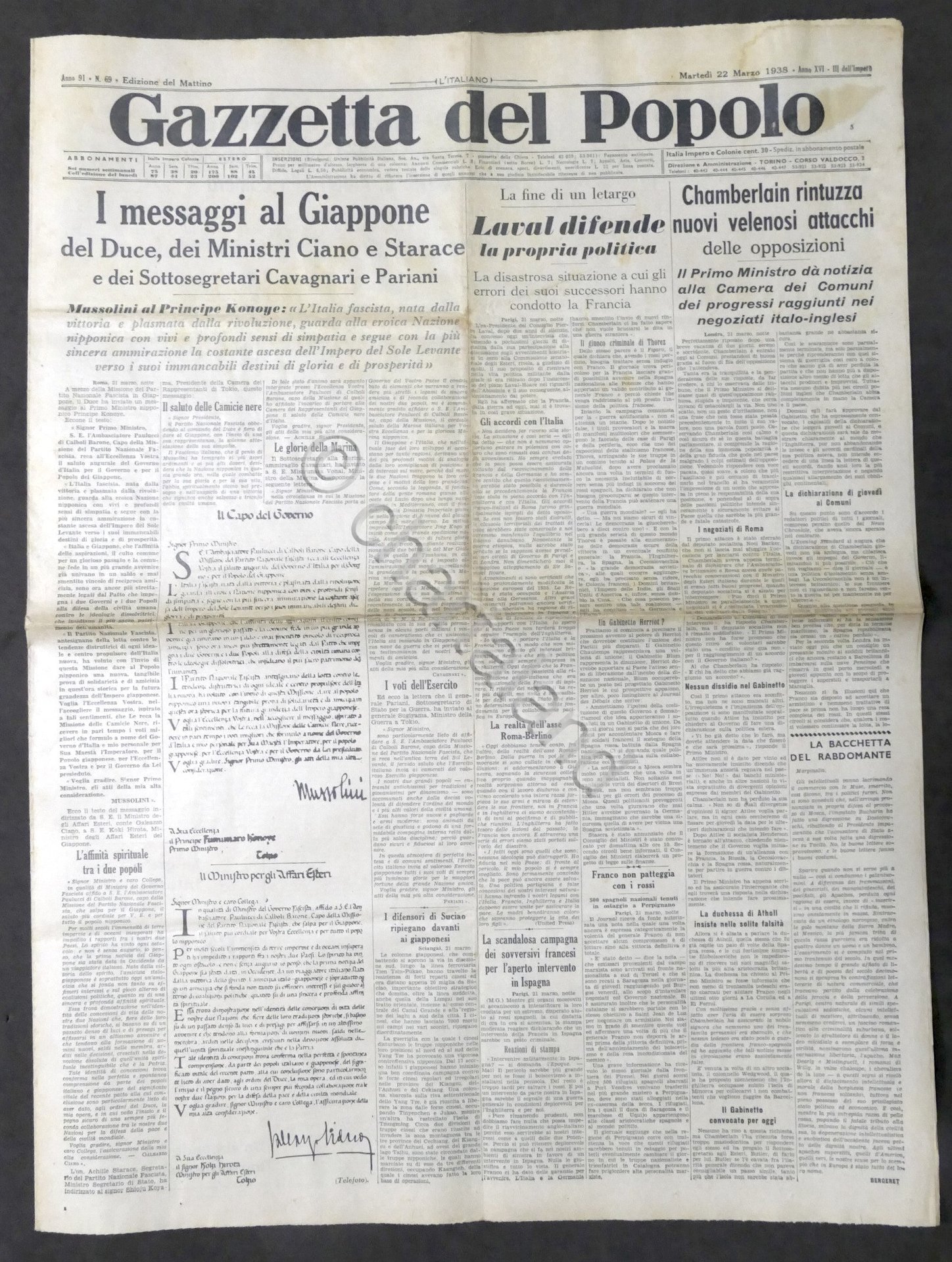 Giornale Gazzetta del Popolo N. 69 - I messaggi al Giappone - 1938
