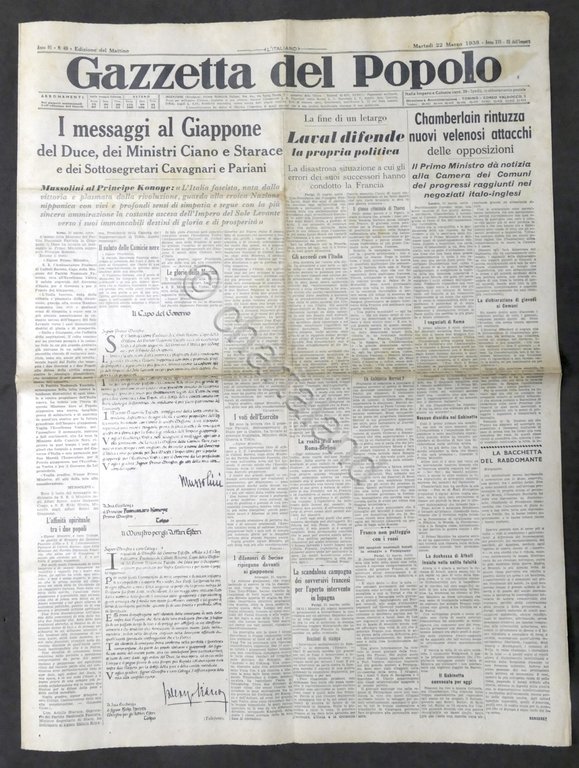 Giornale Gazzetta del Popolo N. 69 - I messaggi al Giappone - 1938 Testo in lingua italiana, Pag. 6 con illustrazioni Condizioni buone